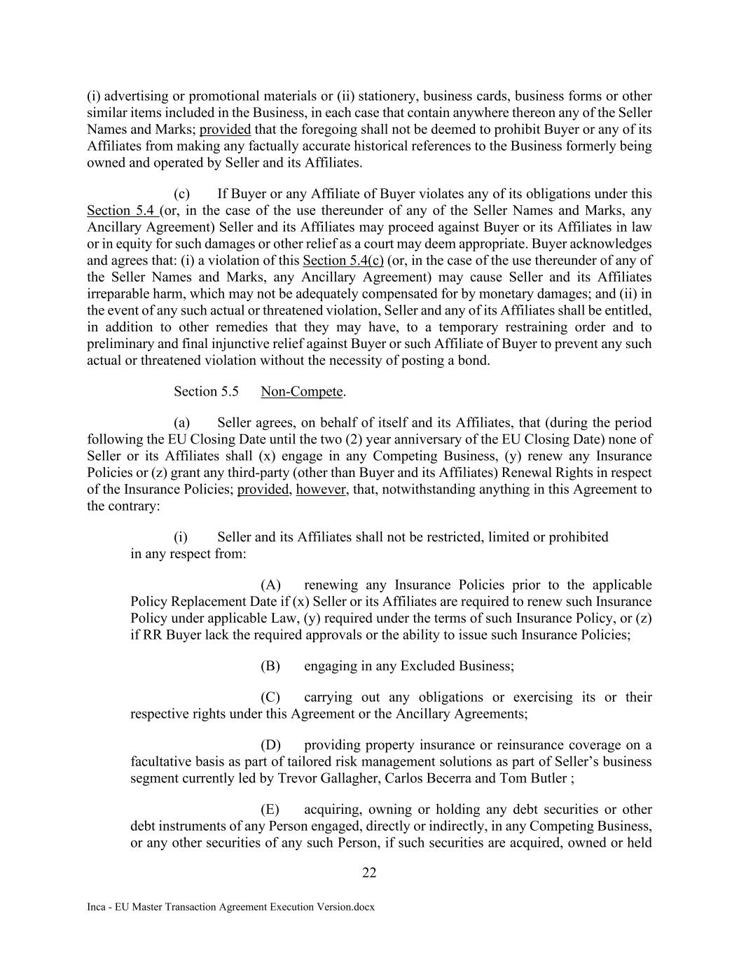 22 Inca - EU Master Transaction Agreement Execution Version.docx (i) advertising or promotional materials or (ii) stationery, business cards, business forms or other similar items included in the Business, in each case that contain anywhere thereon any of the Seller Names and Marks; provided that the foregoing shall not be deemed to prohibit Buyer or any of its Affiliates from making any factually accurate historical references to the Business formerly being owned and operated by Seller and its Affiliates. (c) If Buyer or any Affiliate of Buyer violates any of its obligations under this Section 5.4 (or, in the case of the use thereunder of any of the Seller Names and Marks, any Ancillary Agreement) Seller and its Affiliates may proceed against Buyer or its Affiliates in law or in equity for such damages or other relief as a court may deem appropriate. Buyer acknowledges and agrees that: (i) a violation of this Section 5.4(c) (or, in the case of the use thereunder of any of the Seller Names and Marks, any Ancillary Agreement) may cause Seller and its Affiliates irreparable harm, which may not be adequately compensated for by monetary damages; and (ii) in the event of any such actual or threatened violation, Seller and any of its Affiliates shall be entitled, in addition to other remedies that they may have, to a temporary restraining order and to preliminary and final injunctive relief against Buyer or such Affiliate of Buyer to prevent any such actual or threatened violation without the necessity of posting a bond. Section 5.5 Non-Compete. (a) Seller agrees, on behalf of itself and its Affiliates, that (during the period following the EU Closing Date until the two (2) year anniversary of the EU Closing Date) none of Seller or its Affiliates shall (x) engage in any Competing Business, (y) renew any Insurance Policies or (z) grant any third-party (other than Buyer and its Affiliates) Renewal Rights in respect of the Insurance Policies; provided, however, that, notwithstanding anything in this Agreement to the contrary: (i) Seller and its Affiliates shall not be restricted, limited or prohibited in any respect from: (A) renewing any Insurance Policies prior to the applicable Policy Replacement Date if (x) Seller or its Affiliates are required to renew such Insurance Policy under applicable Law, (y) required under the terms of such Insurance Policy, or (z) if RR Buyer lack the required approvals or the ability to issue such Insurance Policies; (B) engaging in any Excluded Business; (C) carrying out any obligations or exercising its or their respective rights under this Agreement or the Ancillary Agreements; (D) providing property insurance or reinsurance coverage on a facultative basis as part of tailored risk management solutions as part of Seller’s business segment currently led by Trevor Gallagher, Carlos Becerra and Tom Butler ; (E) acquiring, owning or holding any debt securities or other debt instruments of any Person engaged, directly or indirectly, in any Competing Business, or any other securities of any such Person, if such securities are acquired, owned or held