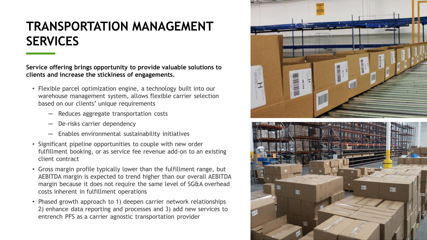 10 TRANSPORTATION MANAGEMENT SERVICES ____ Service offering brings opportunity to provide valuable solutions to clients and increase the stickiness of engagements. • Flexible parcel optimization engine, a technology built into our warehouse management system, allows flexible carrier selection based on our clients’ unique requirements ─ Reduces aggregate transportation costs ─ De-risks carrier dependency ─ Enables environmental sustainability initiatives • Significant pipeline opportunities to couple with new order fulfillment booking, or as service fee revenue add-on to an existing client contract • Gross margin profile typically lower than the fulfillment range, but AEBITDA margin is expected to trend higher than our overall AEBITDA margin because it does not require the same level of SG&A overhead costs inherent in fulfillment operations • Phased growth approach to 1) deepen carrier network relationships 2) enhance data reporting and processes and 3) add new services to entrench PFS as a carrier agnostic transportation provider