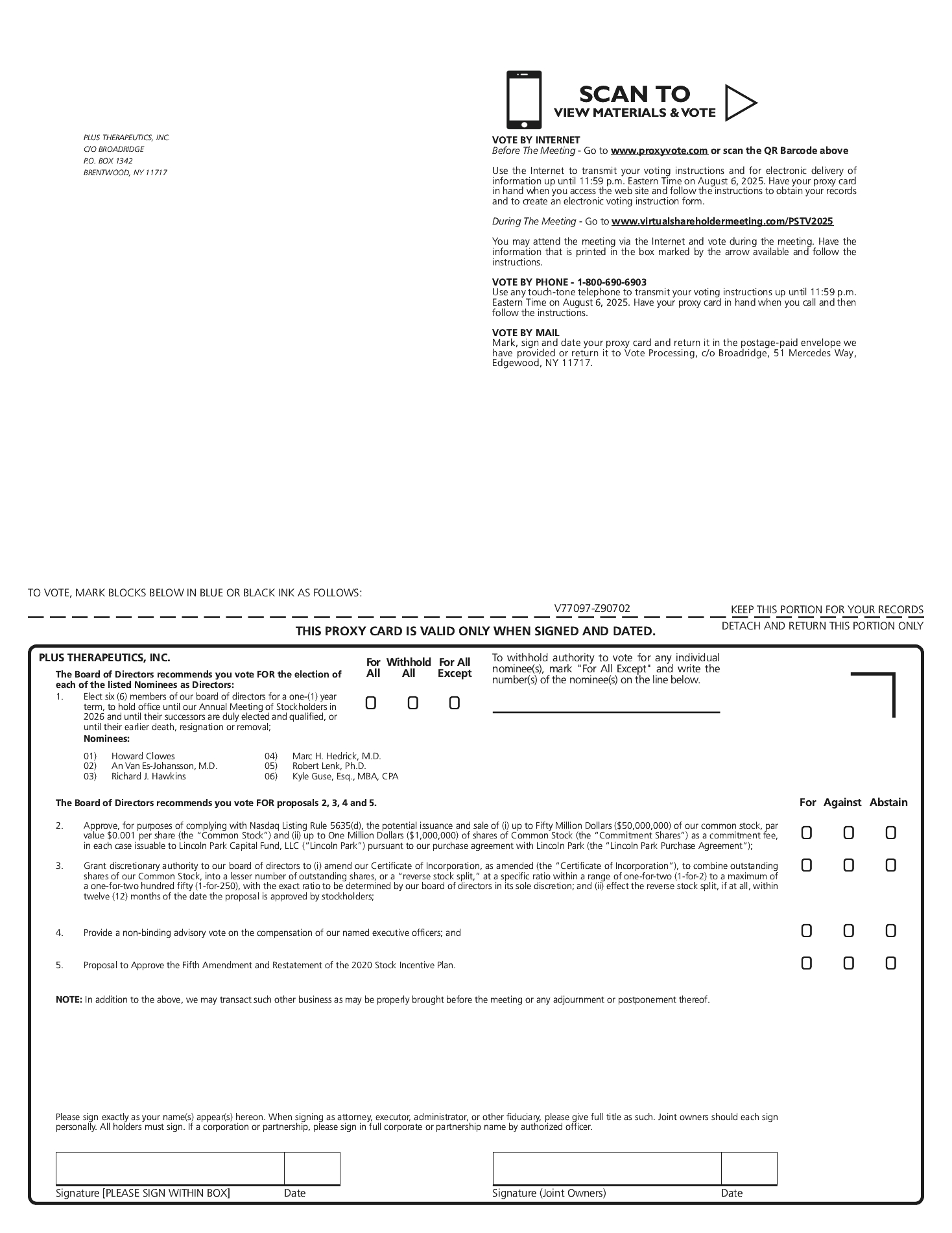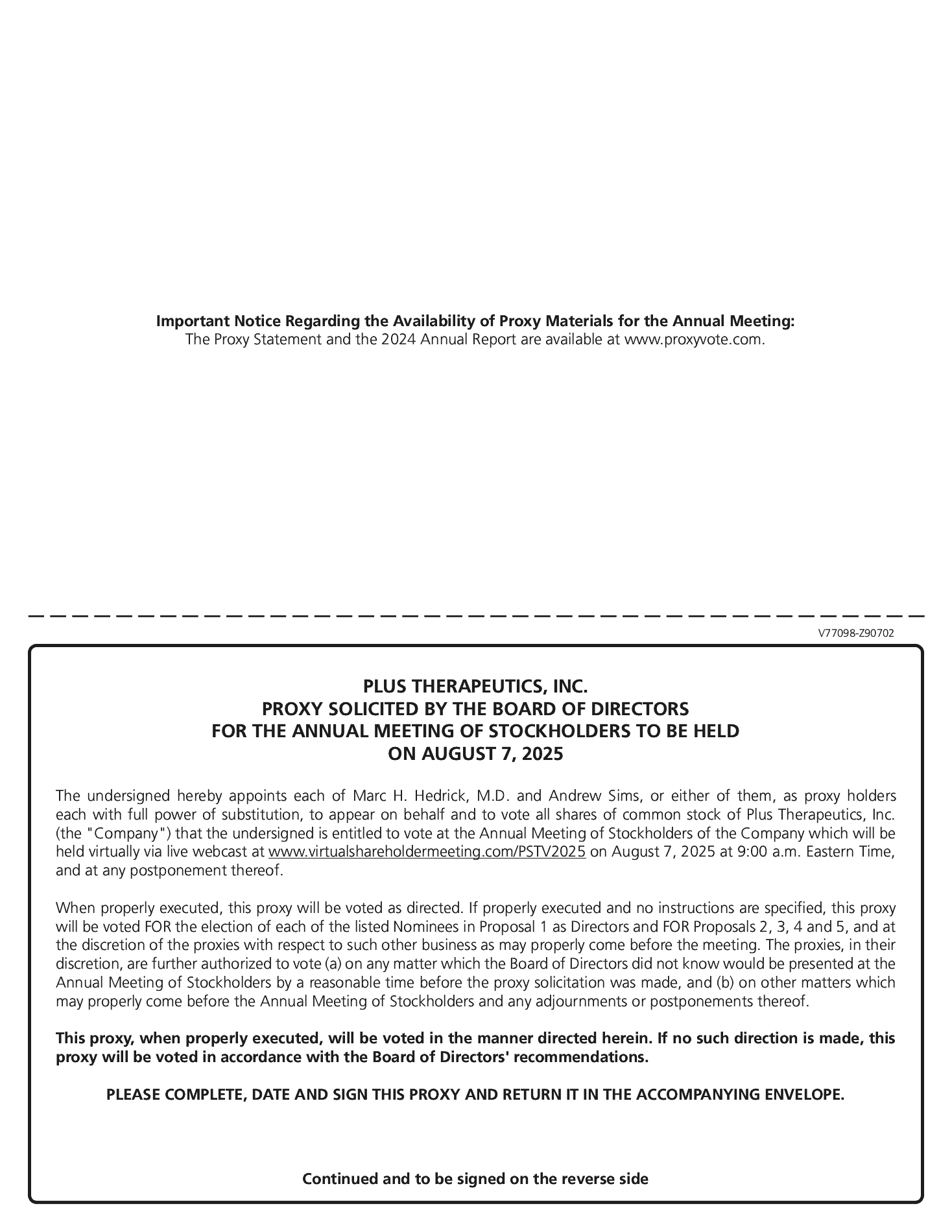 You are cordially invited to attend the 2025 Annual Meeting of the Stockholders of Plus Therapeutics, Inc. (the “Annual Meeting”). The Annual Meeting will be held on August 7, 2025, commencing at 9:00 a.m. (Eastern Time), and will be a completely virtual meeting of stockholders.