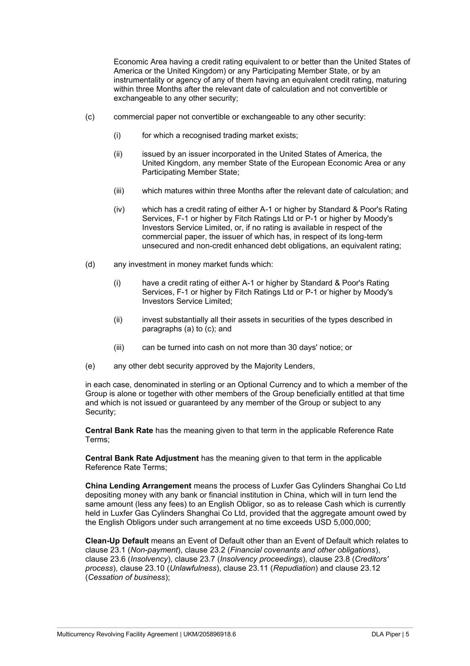 Multicurrency Revolving Facility Agreement | UKM/205896918.6 DLA Piper | 5 Economic Area having a credit rating equivalent to or better than the United States of America or the United Kingdom) or any Participating Member State, or by an instrumentality or agency of any of them having an equivalent credit rating, maturing within three Months after the relevant date of calculation and not convertible or exchangeable to any other security; (c) commercial paper not convertible or exchangeable to any other security: (i) for which a recognised trading market exists; (ii) issued by an issuer incorporated in the United States of America, the United Kingdom, any member State of the European Economic Area or any Participating Member State; (iii) which matures within three Months after the relevant date of calculation; and (iv) which has a credit rating of either A-1 or higher by Standard & Poor's Rating Services, F-1 or higher by Fitch Ratings Ltd or P-1 or higher by Moody's Investors Service Limited, or, if no rating is available in respect of the commercial paper, the issuer of which has, in respect of its long-term unsecured and non-credit enhanced debt obligations, an equivalent rating; (d) any investment in money market funds which: (i) have a credit rating of either A-1 or higher by Standard & Poor's Rating Services, F-1 or higher by Fitch Ratings Ltd or P-1 or higher by Moody's Investors Service Limited; (ii) invest substantially all their assets in securities of the types described in paragraphs (a) to (c); and (iii) can be turned into cash on not more than 30 days' notice; or (e) any other debt security approved by the Majority Lenders, in each case, denominated in sterling or an Optional Currency and to which a member of the Group is alone or together with other members of the Group beneficially entitled at that time and which is not issued or guaranteed by any member of the Group or subject to any Security; Central Bank Rate has the meaning given to that term in the applicable Reference Rate Terms; Central Bank Rate Adjustment has the meaning given to that term in the applicable Reference Rate Terms; China Lending Arrangement means the process of Luxfer Gas Cylinders Shanghai Co Ltd depositing money with any bank or financial institution in China, which will in turn lend the same amount (less any fees) to an English Obligor, so as to release Cash which is currently held in Luxfer Gas Cylinders Shanghai Co Ltd, provided that the aggregate amount owed by the English Obligors under such arrangement at no time exceeds USD 5,000,000; Clean-Up Default means an Event of Default other than an Event of Default which relates to clause 23.1 (Non-payment), clause 23.2 (Financial covenants and other obligations), clause 23.6 (Insolvency), clause 23.7 (Insolvency proceedings), clause 23.8 (Creditors' process), clause 23.10 (Unlawfulness), clause 23.11 (Repudiation) and clause 23.12 (Cessation of business);