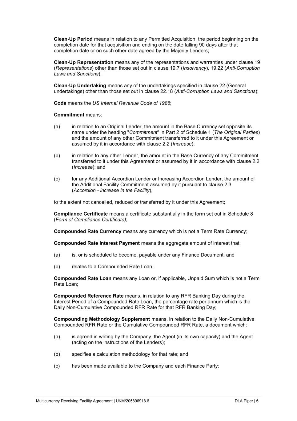 Multicurrency Revolving Facility Agreement | UKM/205896918.6 DLA Piper | 6 Clean-Up Period means in relation to any Permitted Acquisition, the period beginning on the completion date for that acquisition and ending on the date falling 90 days after that completion date or on such other date agreed by the Majority Lenders; Clean-Up Representation means any of the representations and warranties under clause 19 (Representations) other than those set out in clause 19.7 (Insolvency), 19.22 (Anti-Corruption Laws and Sanctions), Clean-Up Undertaking means any of the undertakings specified in clause 22 (General undertakings) other than those set out in clause 22.18 (Anti-Corruption Laws and Sanctions); Code means the US Internal Revenue Code of 1986; Commitment means: (a) in relation to an Original Lender, the amount in the Base Currency set opposite its name under the heading "Commitment" in Part 2 of Schedule 1 (The Original Parties) and the amount of any other Commitment transferred to it under this Agreement or assumed by it in accordance with clause 2.2 (Increase); (b) in relation to any other Lender, the amount in the Base Currency of any Commitment transferred to it under this Agreement or assumed by it in accordance with clause 2.2 (Increase); and (c) for any Additional Accordion Lender or Increasing Accordion Lender, the amount of the Additional Facility Commitment assumed by it pursuant to clause 2.3 (Accordion - increase in the Facility), to the extent not cancelled, reduced or transferred by it under this Agreement; Compliance Certificate means a certificate substantially in the form set out in Schedule 8 (Form of Compliance Certificate); Compounded Rate Currency means any currency which is not a Term Rate Currency; Compounded Rate Interest Payment means the aggregate amount of interest that: (a) is, or is scheduled to become, payable under any Finance Document; and (b) relates to a Compounded Rate Loan; Compounded Rate Loan means any Loan or, if applicable, Unpaid Sum which is not a Term Rate Loan; Compounded Reference Rate means, in relation to any RFR Banking Day during the Interest Period of a Compounded Rate Loan, the percentage rate per annum which is the Daily Non-Cumulative Compounded RFR Rate for that RFR Banking Day; Compounding Methodology Supplement means, in relation to the Daily Non-Cumulative Compounded RFR Rate or the Cumulative Compounded RFR Rate, a document which: (a) is agreed in writing by the Company, the Agent (in its own capacity) and the Agent (acting on the instructions of the Lenders); (b) specifies a calculation methodology for that rate; and (c) has been made available to the Company and each Finance Party;