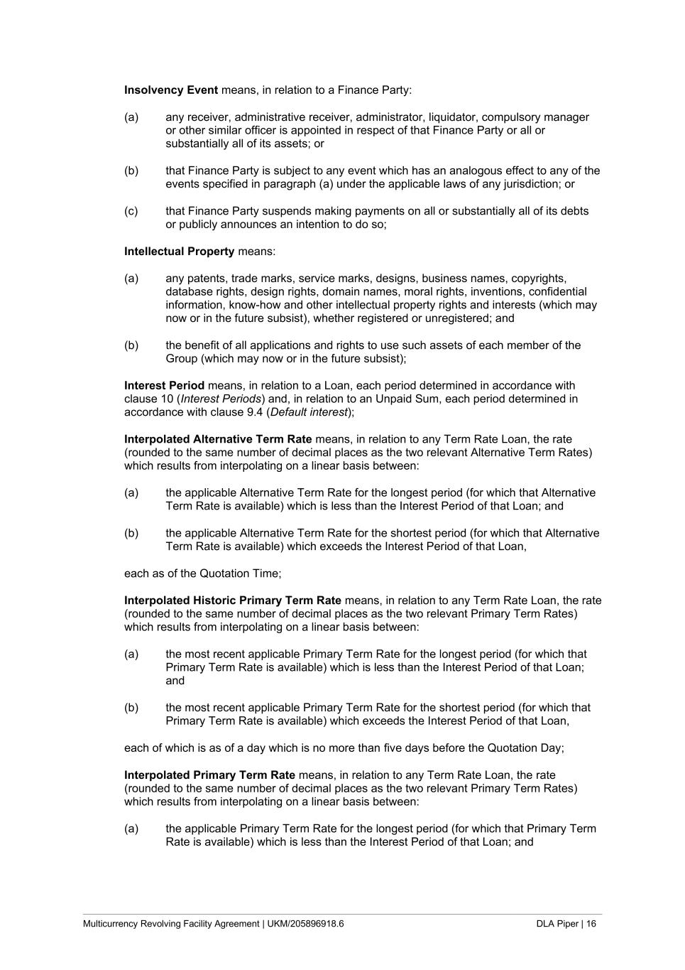 Multicurrency Revolving Facility Agreement | UKM/205896918.6 DLA Piper | 16 Insolvency Event means, in relation to a Finance Party: (a) any receiver, administrative receiver, administrator, liquidator, compulsory manager or other similar officer is appointed in respect of that Finance Party or all or substantially all of its assets; or (b) that Finance Party is subject to any event which has an analogous effect to any of the events specified in paragraph (a) under the applicable laws of any jurisdiction; or (c) that Finance Party suspends making payments on all or substantially all of its debts or publicly announces an intention to do so; Intellectual Property means: (a) any patents, trade marks, service marks, designs, business names, copyrights, database rights, design rights, domain names, moral rights, inventions, confidential information, know-how and other intellectual property rights and interests (which may now or in the future subsist), whether registered or unregistered; and (b) the benefit of all applications and rights to use such assets of each member of the Group (which may now or in the future subsist); Interest Period means, in relation to a Loan, each period determined in accordance with clause 10 (Interest Periods) and, in relation to an Unpaid Sum, each period determined in accordance with clause 9.4 (Default interest); Interpolated Alternative Term Rate means, in relation to any Term Rate Loan, the rate (rounded to the same number of decimal places as the two relevant Alternative Term Rates) which results from interpolating on a linear basis between: (a) the applicable Alternative Term Rate for the longest period (for which that Alternative Term Rate is available) which is less than the Interest Period of that Loan; and (b) the applicable Alternative Term Rate for the shortest period (for which that Alternative Term Rate is available) which exceeds the Interest Period of that Loan, each as of the Quotation Time; Interpolated Historic Primary Term Rate means, in relation to any Term Rate Loan, the rate (rounded to the same number of decimal places as the two relevant Primary Term Rates) which results from interpolating on a linear basis between: (a) the most recent applicable Primary Term Rate for the longest period (for which that Primary Term Rate is available) which is less than the Interest Period of that Loan; and (b) the most recent applicable Primary Term Rate for the shortest period (for which that Primary Term Rate is available) which exceeds the Interest Period of that Loan, each of which is as of a day which is no more than five days before the Quotation Day; Interpolated Primary Term Rate means, in relation to any Term Rate Loan, the rate (rounded to the same number of decimal places as the two relevant Primary Term Rates) which results from interpolating on a linear basis between: (a) the applicable Primary Term Rate for the longest period (for which that Primary Term Rate is available) which is less than the Interest Period of that Loan; and