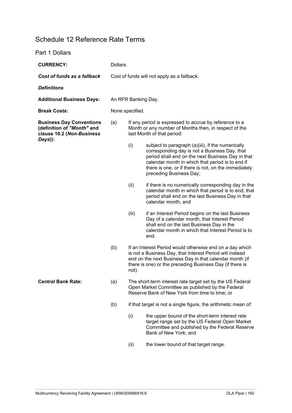 Multicurrency Revolving Facility Agreement | UKM/205896918.6 DLA Piper | 160 Schedule 12 Reference Rate Terms Part 1 Dollars CURRENCY: Dollars. Cost of funds as a fallback Cost of funds will not apply as a fallback. Definitions Additional Business Days: An RFR Banking Day. Break Costs: None specified. Business Day Conventions (definition of "Month" and clause 10.2 (Non-Business Days)): (a) If any period is expressed to accrue by reference to a Month or any number of Months then, in respect of the last Month of that period: (i) subject to paragraph (a)(iii), if the numerically corresponding day is not a Business Day, that period shall end on the next Business Day in that calendar month in which that period is to end if there is one, or if there is not, on the immediately preceding Business Day; (ii) if there is no numerically corresponding day in the calendar month in which that period is to end, that period shall end on the last Business Day in that calendar month; and (iii) if an Interest Period begins on the last Business Day of a calendar month, that Interest Period shall end on the last Business Day in the calendar month in which that Interest Period is to end. (b) If an Interest Period would otherwise end on a day which is not a Business Day, that Interest Period will instead end on the next Business Day in that calendar month (if there is one) or the preceding Business Day (if there is not). Central Bank Rate: (a) The short-term interest rate target set by the US Federal Open Market Committee as published by the Federal Reserve Bank of New York from time to time; or (b) if that target is not a single figure, the arithmetic mean of: (i) the upper bound of the short-term interest rate target range set by the US Federal Open Market Committee and published by the Federal Reserve Bank of New York; and (ii) the lower bound of that target range.