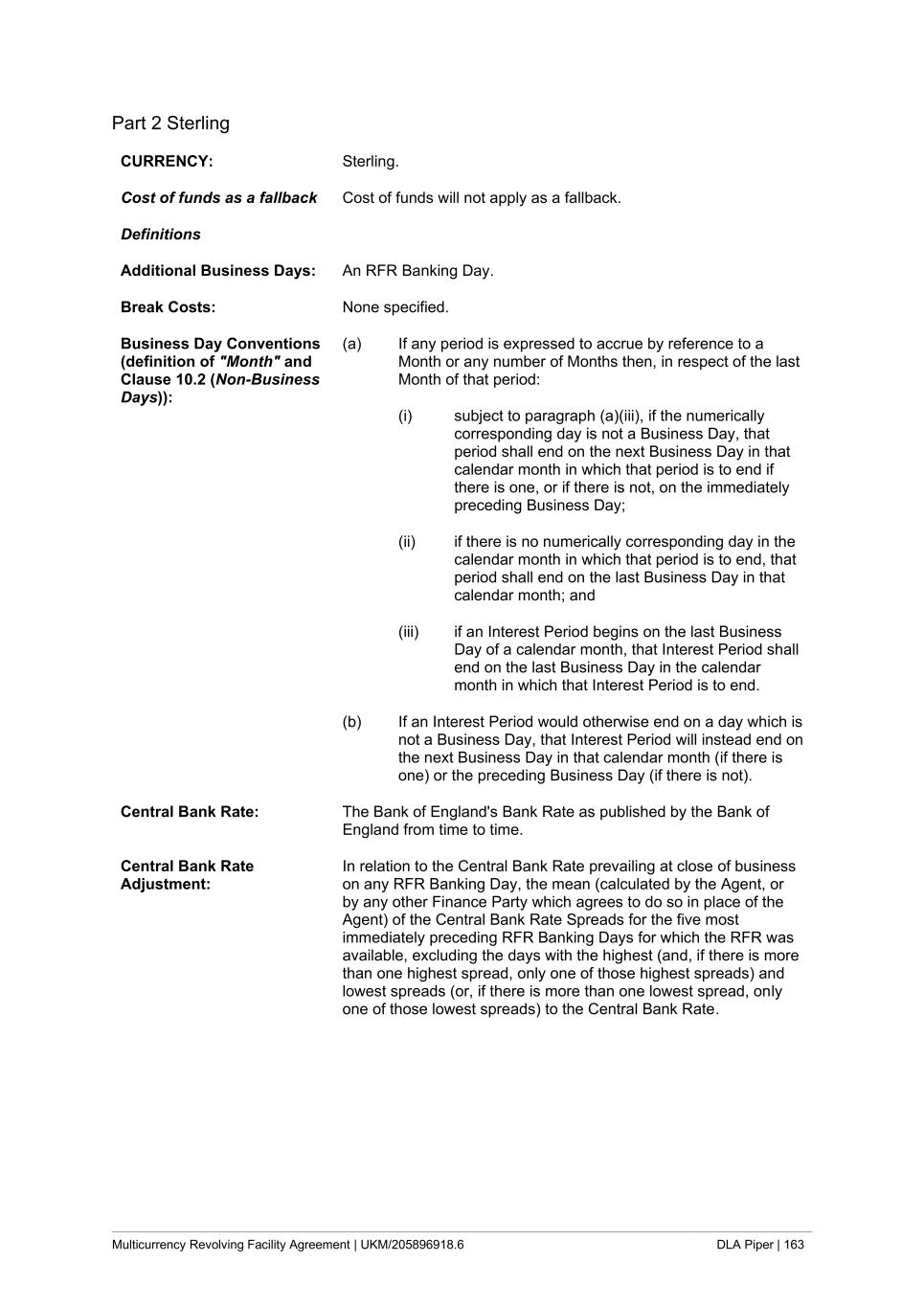 Multicurrency Revolving Facility Agreement | UKM/205896918.6 DLA Piper | 163 Part 2 Sterling CURRENCY: Sterling. Cost of funds as a fallback Cost of funds will not apply as a fallback. Definitions Additional Business Days: An RFR Banking Day. Break Costs: None specified. Business Day Conventions (definition of "Month" and Clause 10.2 (Non-Business Days)): (a) If any period is expressed to accrue by reference to a Month or any number of Months then, in respect of the last Month of that period: (i) subject to paragraph (a)(iii), if the numerically corresponding day is not a Business Day, that period shall end on the next Business Day in that calendar month in which that period is to end if there is one, or if there is not, on the immediately preceding Business Day; (ii) if there is no numerically corresponding day in the calendar month in which that period is to end, that period shall end on the last Business Day in that calendar month; and (iii) if an Interest Period begins on the last Business Day of a calendar month, that Interest Period shall end on the last Business Day in the calendar month in which that Interest Period is to end. (b) If an Interest Period would otherwise end on a day which is not a Business Day, that Interest Period will instead end on the next Business Day in that calendar month (if there is one) or the preceding Business Day (if there is not). Central Bank Rate: The Bank of England's Bank Rate as published by the Bank of England from time to time. Central Bank Rate Adjustment: In relation to the Central Bank Rate prevailing at close of business on any RFR Banking Day, the mean (calculated by the Agent, or by any other Finance Party which agrees to do so in place of the Agent) of the Central Bank Rate Spreads for the five most immediately preceding RFR Banking Days for which the RFR was available, excluding the days with the highest (and, if there is more than one highest spread, only one of those highest spreads) and lowest spreads (or, if there is more than one lowest spread, only one of those lowest spreads) to the Central Bank Rate.