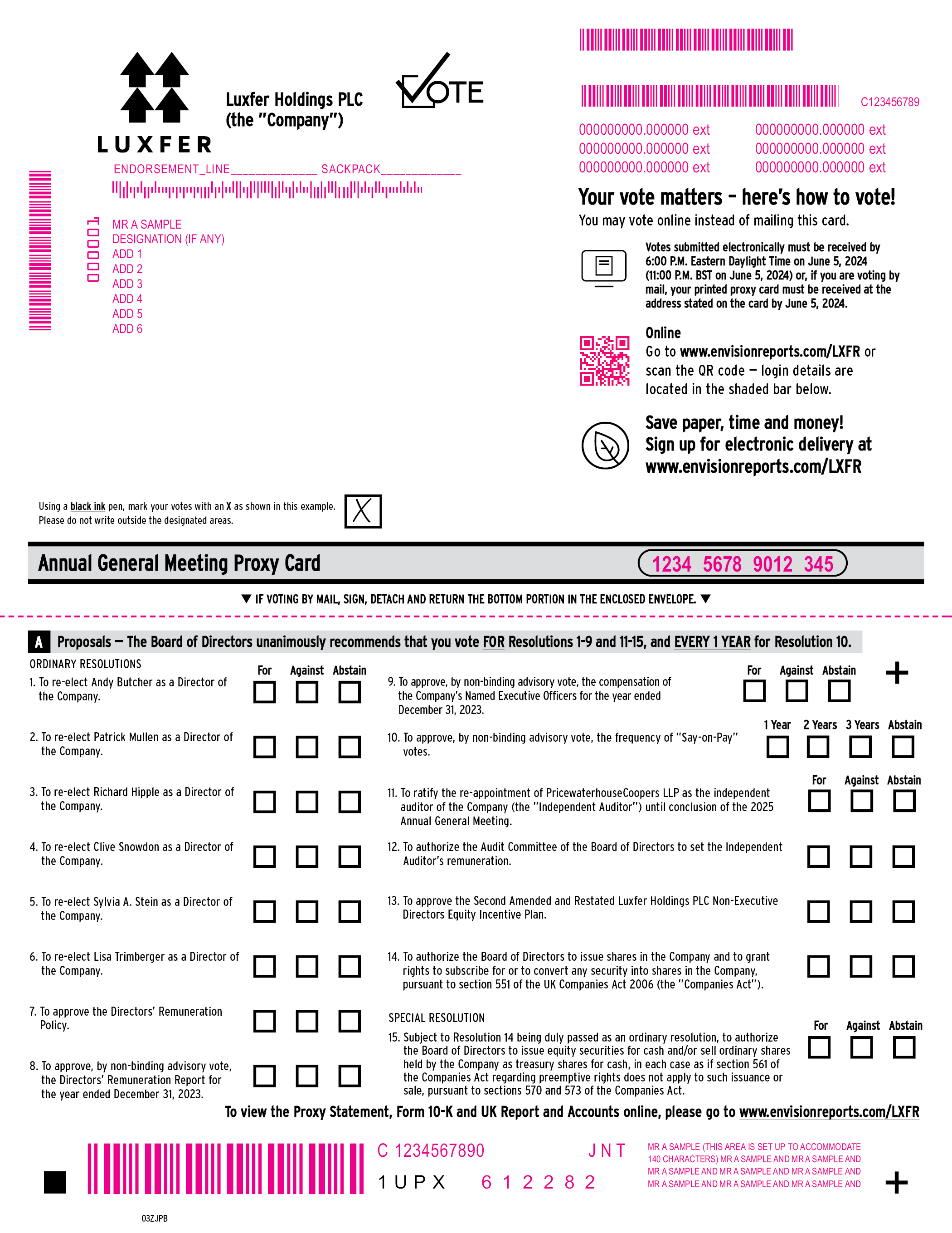 Luxfer Holdings PLC (the ”Company”) C123456789 ENDORSEMENT_LINE SACKPACK 000000000.000000 ext 000000000.000000 ext 000000000.000000 ext 000000000.000000 ext 000000000.000000 ext 000000000.000000 ext 000001 MR A SAMPLE DESIGNATION (IF ANY) ADD 1 ADD 2 ADD 3 ADD 4 ADD 5 ADD 6 Your vote matters – here’s how to vote! You may vote online instead of mailing this card. Votes submitted electronically must be received by 6:00 P.M. Eastern Daylight Time on June 5, 2024 (11:00 P.M. BST on June 5, 2024) or, if you are voting by mail, your printed proxy card must be received at the address stated on the card by June 5, 2024. Online Go to www.envisionreports.com/LXFR or scan the QR code — login details are located in the shaded bar below. Save paper, time and money! Sign up for electronic delivery at www.envisionreports.com/LXFR Using a black ink pen, mark your votes with an X as shown in this example. Please do not write outside the designated areas. Annual General Meeting Proxy Card 1234 5678 9012 345 IF VOTING BY MAIL, SIGN, DETACH AND RETURN THE BOTTOM PORTION IN THE ENCLOSED ENVELOPE. A Proposals-The Board of Directors unanimously recommends that you vote FOR Resolutions 1-9 and 11-15, and EVERY 1 YEAR for Resolution 10. ORDINARY RESOLUTIONS For Against Abstain 1. To re-elect Andy Butcher as a Director of the Company. 2. To re-elect Patrick Mullen as a Director of the Company. 3. To re-elect Richard Hipple as a Director of the Company. 4. To re-elect Clive Snowdon as a Director of the Company. 5. To re-elect Sylvia A. Stein as a Director of the Company. 6. To re-elect Lisa Trimberger as a Director of the Company. 7. To approve the Directors’ Remuneration Policy. 8. To approve, by non-binding advisory vote, the Directors’ Remuneration Report for the year ended December 31, 2023. 9. To approve, by non-binding advisory vote, the compensation of the Company’s Named Executive Officers for the year ended December 31, 2023. 10. To approve, by non-binding advisory vote, the frequency of ”Say-on-Pay” votes. 1 Year 2 Years 3 Years Abstain 11. To ratify the re-appointment of PricewaterhouseCoopers LLP as the independent auditor of the Company (the ”Independent Auditor”) until conclusion of the 2025 Annual General Meeting. For Against Abstain 12. To authorize the Audit Committee of the Board of Directors to set the Independent Auditor’s remuneration. 13. To approve the Second Amended and Restated Luxfer Holdings PLC Non-Executive Directors Equity Incentive Plan. 14. To authorize the Board of Directors to issue shares in the Company and to grant rights to subscribe for or to convert any security into shares in the Company, pursuant to section 551 of the UK Companies Act 2006 (the ”Companies Act”). SPECIAL RESOLUTION For Against Abstain 15. Subject to Resolution 14 being duly passed as an ordinary resolution, to authorize the Board of Directors to issue equity securities for cash and/or sell ordinary shares held by the Company as treasury shares for cash, in each case as if section 561 of the Companies Act regarding preemptive rights does not apply to such issuance or sale, pursuant to sections 570 and 573 of the Companies Act. To view the Proxy Statement, Form 10-K and UK Report and Accounts online, please go to www.envisionreports.com/LXFR C 1234567890 J N T MR A SAMPLE (THIS AREA IS SET UP TO ACCOMMODATE 140 CHARACTERS) MR A SAMPLE AND MR A SAMPLE AND MR A SAMPLE AND MR A SAMPLE AND MR A SAMPLE AND MR A SAMPLE AND MR A SAMPLE AND MR A SAMPLE AND 1 U P X 6 1 2 2 8 2 03ZJPB