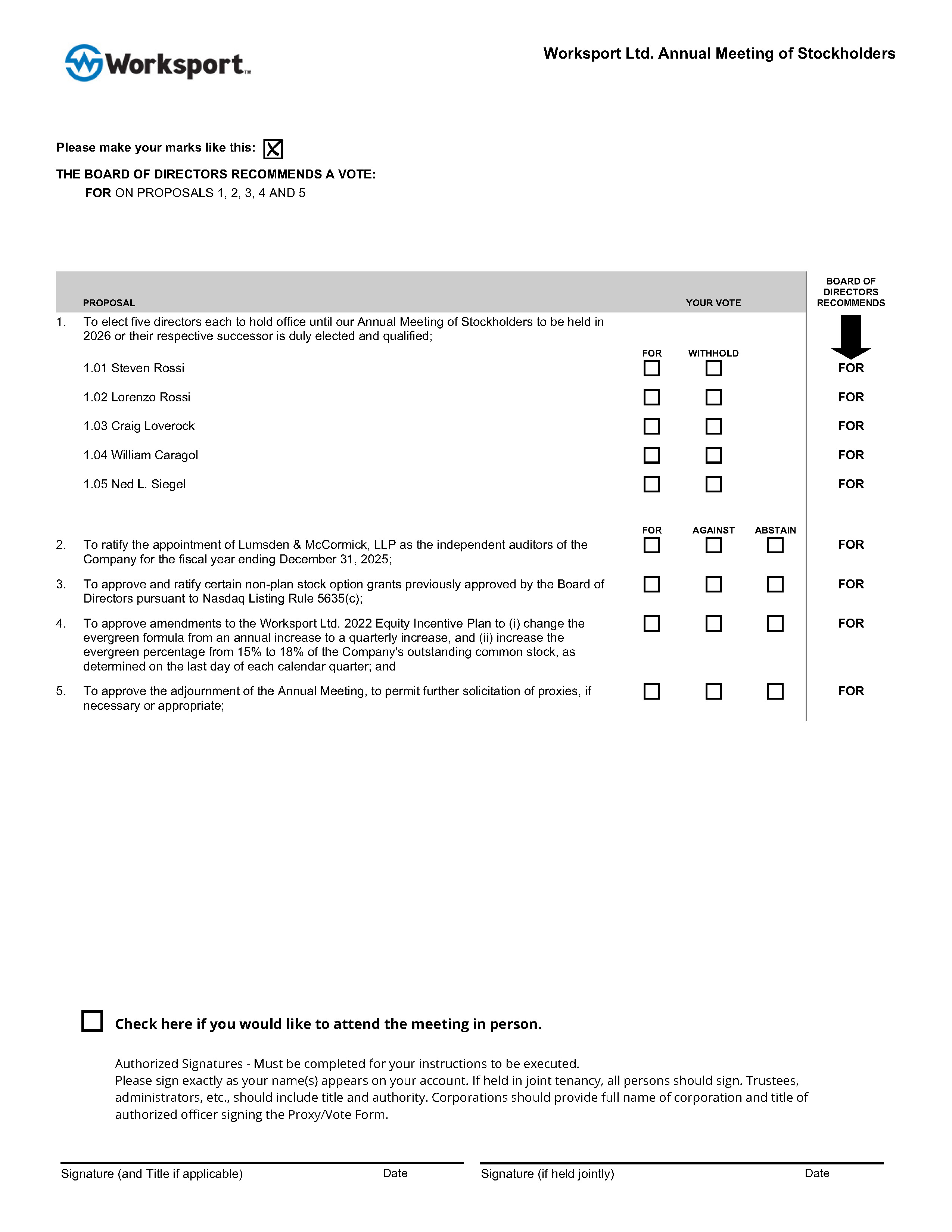 At the Annual Meeting, stockholders will be asked to: (1) elect five directors; (2) ratify the appointment of the auditors of the Company for the fiscal year ended December 31, 2025; (3) approve and ratify certain non-plan stock option grants previously approved by the Board of Directors pursuant to Nasdaq Listing Rule 5635(c); (4) approve amendments to the Worksport Ltd. 2022 Equity Incentive Plan to (i) change the evergreen formula from an annual increase to a quarterly increase, and (ii) increase the evergreen percentage from 15% to 18% of the Company’s outstanding common stock, as determined on the last day of each calendar quarter; and (5) approve the adjournment of the Annual Meeting, to permit further solicitation of proxies, if necessary or appropriate (the “Adjournment Proposal”). The Board of Directors (“Board”) believes that the proposals being submitted for stockholder approval are in the best interests of the Company and its stockholders and recommends a vote consistent with the Board’s recommendation for each proposal.