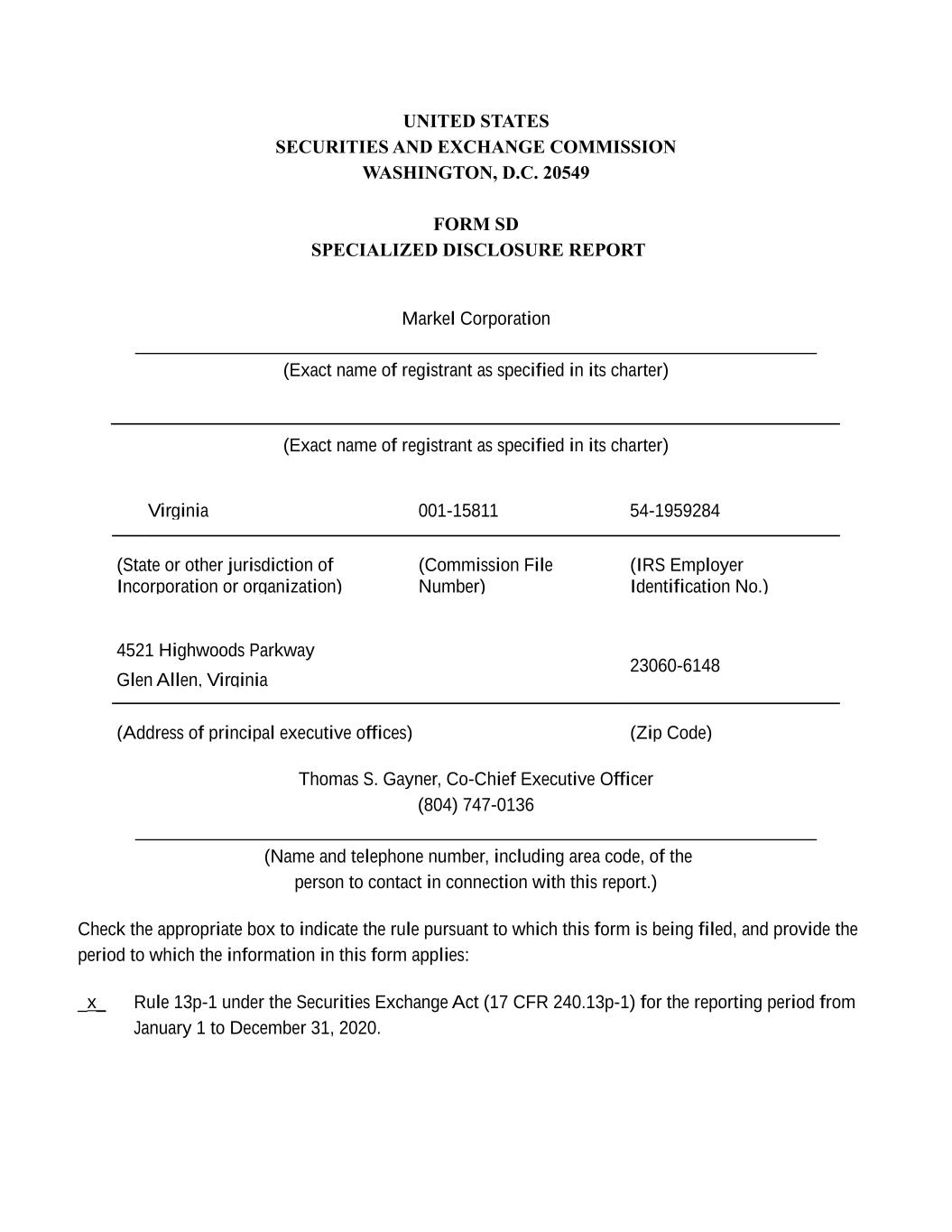 UNITED STATES SECURITIES AND EXCHANGE COMMISSION WASHINGTON, D.C. 20549 FORM SD SPECIALIZED DISCLOSURE REPORT Markel Corporation _________________________________________________________________________ (Exact name of registrant as specified in its charter) (Exact name of registrant as specified in its charter) Virginia 001-15811 54-1959284 (State or other jurisdiction of Incorporation or organization) (Commission File Number) (IRS Employer Identification No.) 4521 Highwoods Parkway Glen Allen, Virginia 23060-6148 (Address of principal executive offices) (Zip Code) Thomas S. Gayner, Co-Chief Executive Officer (804) 747-0136 _________________________________________________________________________ (Name and telephone number, including area code, of the person to contact in connection with this report.) Check the appropriate box to indicate the rule pursuant to which this form is being filed, and provide the period to which the information in this form applies: _x_ Rule 13p-1 under the Securities Exchange Act (17 CFR 240.13p-1) for the reporting period from January 1 to December 31, 2020.