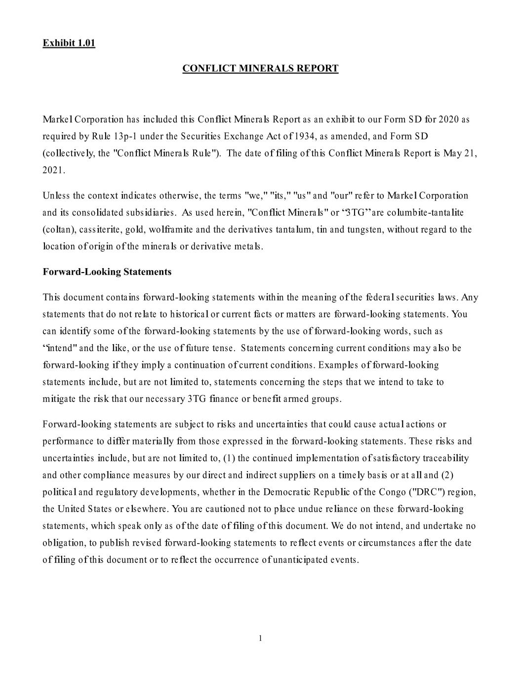 1 Exhibit 1.01 CONFLICT MINERALS REPORT Markel Corporation has included this Conflict Minerals Report as an exhibit to our Form SD for 2020 as required by Rule 13p-1 under the Securities Exchange Act of 1934, as amended, and Form SD (collectively, the "Conflict Minerals Rule"). The date of filing of this Conflict Minerals Report is May 21, 2021. Unless the context indicates otherwise, the terms "we," "its," "us" and "our" refer to Markel Corporation and its consolidated subsidiaries. As used herein, "Conflict Minerals" or “3TG” are columbite-tantalite (coltan), cassiterite, gold, wolframite and the derivatives tantalum, tin and tungsten, without regard to the location of origin of the minerals or derivative metals. Forward-Looking Statements This document contains forward-looking statements within the meaning of the federal securities laws. Any statements that do not relate to historical or current facts or matters are forward-looking statements. You can identify some of the forward-looking statements by the use of forward-looking words, such as “intend" and the like, or the use of future tense. Statements concerning current conditions may also be forward-looking if they imply a continuation of current conditions. Examples of forward-looking statements include, but are not limited to, statements concerning the steps that we intend to take to mitigate the risk that our necessary 3TG finance or benefit armed groups. Forward-looking statements are subject to risks and uncertainties that could cause actual actions or performance to differ materially from those expressed in the forward-looking statements. These risks and uncertainties include, but are not limited to, (1) the continued implementation of satisfactory traceability and other compliance measures by our direct and indirect suppliers on a timely basis or at all and (2) political and regulatory developments, whether in the Democratic Republic of the Congo ("DRC") region, the United States or elsewhere. You are cautioned not to place undue reliance on these forward-looking statements, which speak only as of the date of filing of this document. We do not intend, and undertake no obligation, to publish revised forward-looking statements to reflect events or circumstances after the date of filing of this document or to reflect the occurrence of unanticipated events.