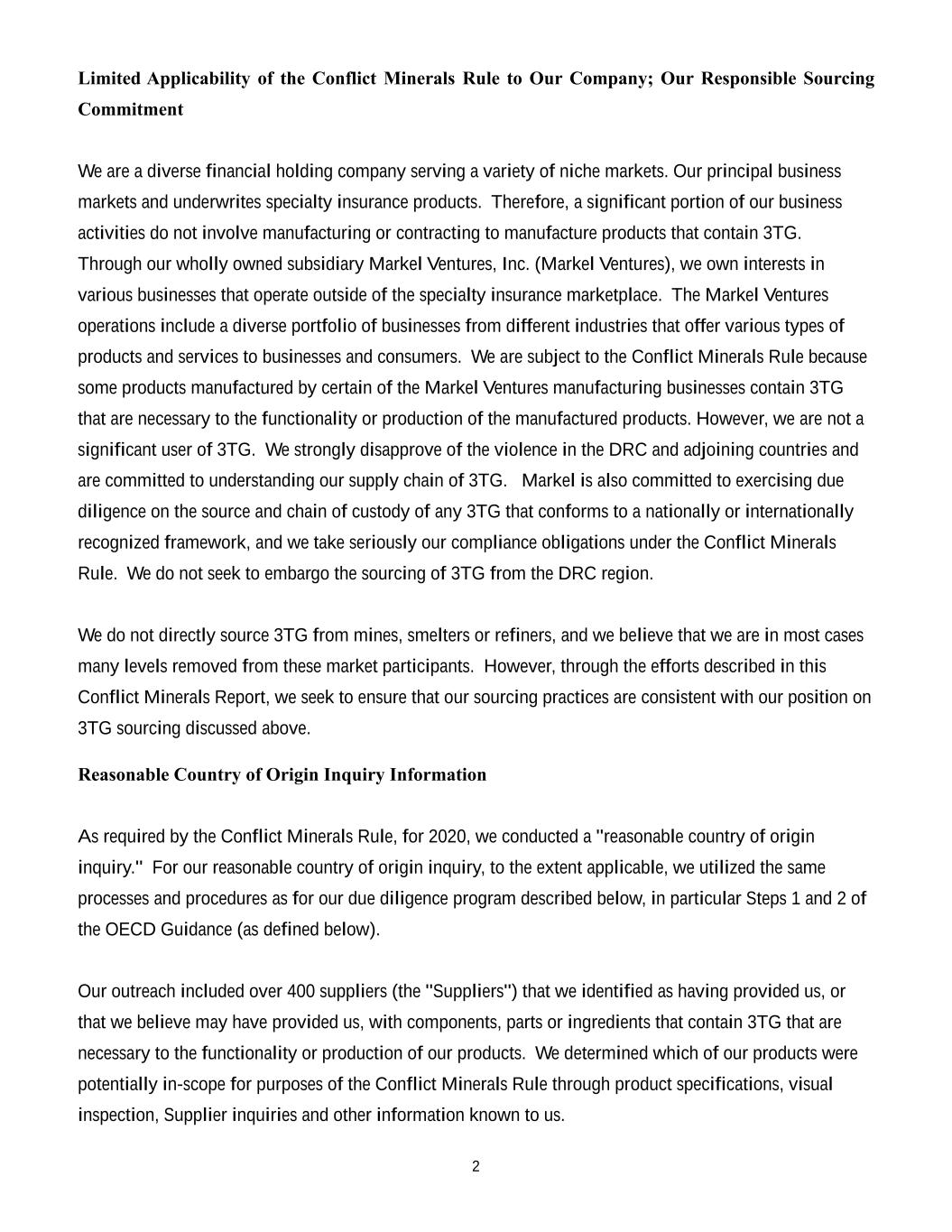 2 Limited Applicability of the Conflict Minerals Rule to Our Company; Our Responsible Sourcing Commitment We are a diverse financial holding company serving a variety of niche markets. Our principal business markets and underwrites specialty insurance products. Therefore, a significant portion of our business activities do not involve manufacturing or contracting to manufacture products that contain 3TG. Through our wholly owned subsidiary Markel Ventures, Inc. (Markel Ventures), we own interests in various businesses that operate outside of the specialty insurance marketplace. The Markel Ventures operations include a diverse portfolio of businesses from different industries that offer various types of products and services to businesses and consumers. We are subject to the Conflict Minerals Rule because some products manufactured by certain of the Markel Ventures manufacturing businesses contain 3TG that are necessary to the functionality or production of the manufactured products. However, we are not a significant user of 3TG. We strongly disapprove of the violence in the DRC and adjoining countries and are committed to understanding our supply chain of 3TG. Markel is also committed to exercising due diligence on the source and chain of custody of any 3TG that conforms to a nationally or internationally recognized framework, and we take seriously our compliance obligations under the Conflict Minerals Rule. We do not seek to embargo the sourcing of 3TG from the DRC region. We do not directly source 3TG from mines, smelters or refiners, and we believe that we are in most cases many levels removed from these market participants. However, through the efforts described in this Conflict Minerals Report, we seek to ensure that our sourcing practices are consistent with our position on 3TG sourcing discussed above. Reasonable Country of Origin Inquiry Information As required by the Conflict Minerals Rule, for 2020, we conducted a "reasonable country of origin inquiry." For our reasonable country of origin inquiry, to the extent applicable, we utilized the same processes and procedures as for our due diligence program described below, in particular Steps 1 and 2 of the OECD Guidance (as defined below). Our outreach included over 400 suppliers (the "Suppliers") that we identified as having provided us, or that we believe may have provided us, with components, parts or ingredients that contain 3TG that are necessary to the functionality or production of our products. We determined which of our products were potentially in-scope for purposes of the Conflict Minerals Rule through product specifications, visual inspection, Supplier inquiries and other information known to us.