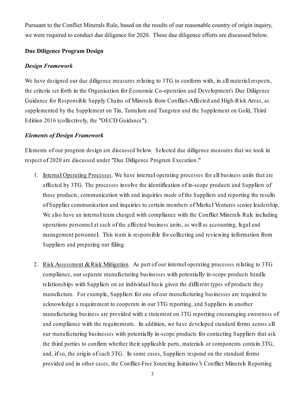 3 Pursuant to the Conflict Minerals Rule, based on the results of our reasonable country of origin inquiry, we were required to conduct due diligence for 2020. These due diligence efforts are discussed below. Due Diligence Program Design Design Framework We have designed our due diligence measures relating to 3TG to conform with, in all material respects, the criteria set forth in the Organisation for Economic Co-operation and Development's Due Diligence Guidance for Responsible Supply Chains of Minerals from Conflict-Affected and High-Risk Areas, as supplemented by the Supplement on Tin, Tantalum and Tungsten and the Supplement on Gold, Third Edition 2016 (collectively, the "OECD Guidance"). Elements of Design Framework Elements of our program design are discussed below. Selected due diligence measures that we took in respect of 2020 are discussed under "Due Diligence Program Execution." 1. Internal Operating Processes. We have internal operating processes for all business units that are affected by 3TG. The processes involve the identification of in-scope products and Suppliers of those products, communication with and inquiries made of the Suppliers and reporting the results of Supplier communication and inquiries to certain members of Markel Ventures senior leadership. We also have an internal team charged with compliance with the Conflict Minerals Rule including operations personnel at each of the affected business units, as well as accounting, legal and management personnel. This team is responsible for collecting and reviewing information from Suppliers and preparing our filing. 2. Risk Assessment & Risk Mitigation. As part of our internal operating processes relating to 3TG compliance, our separate manufacturing businesses with potentially in-scope products handle relationships with Suppliers on an individual basis given the different types of products they manufacture. For example, Suppliers for one of our manufacturing businesses are required to acknowledge a requirement to cooperate in our 3TG reporting, and Suppliers in another manufacturing business are provided with a statement on 3TG reporting encouraging awareness of and compliance with the requirements. In addition, we have developed standard forms across all our manufacturing businesses with potentially in-scope products for contacting Suppliers that ask the third parties to confirm whether their applicable parts, materials or components contain 3TG, and, if so, the origin of such 3TG. In some cases, Suppliers respond on the standard forms provided and in other cases, the Conflict-Free Sourcing Initiative’s Conflict Minerals Reporting