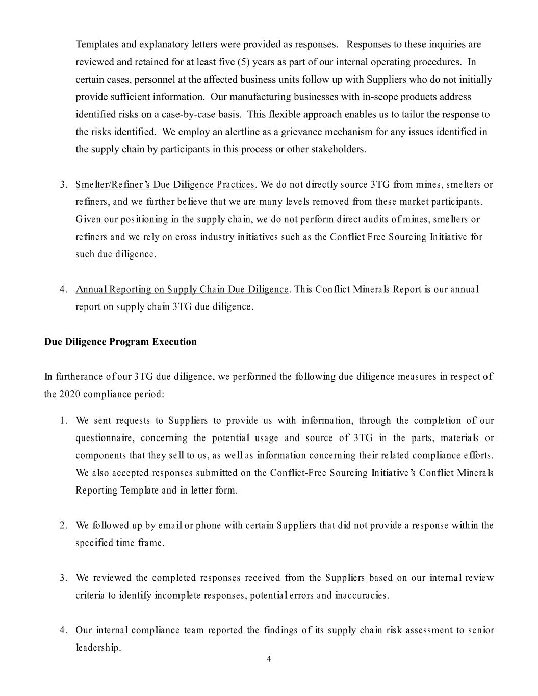 4 Templates and explanatory letters were provided as responses. Responses to these inquiries are reviewed and retained for at least five (5) years as part of our internal operating procedures. In certain cases, personnel at the affected business units follow up with Suppliers who do not initially provide sufficient information. Our manufacturing businesses with in-scope products address identified risks on a case-by-case basis. This flexible approach enables us to tailor the response to the risks identified. We employ an alertline as a grievance mechanism for any issues identified in the supply chain by participants in this process or other stakeholders. 3. Smelter/Refiner’s Due Diligence Practices. We do not directly source 3TG from mines, smelters or refiners, and we further believe that we are many levels removed from these market participants. Given our positioning in the supply chain, we do not perform direct audits of mines, smelters or refiners and we rely on cross industry initiatives such as the Conflict Free Sourcing Initiative for such due diligence. 4. Annual Reporting on Supply Chain Due Diligence. This Conflict Minerals Report is our annual report on supply chain 3TG due diligence. Due Diligence Program Execution In furtherance of our 3TG due diligence, we performed the following due diligence measures in respect of the 2020 compliance period: 1. We sent requests to Suppliers to provide us with information, through the completion of our questionnaire, concerning the potential usage and source of 3TG in the parts, materials or components that they sell to us, as well as information concerning their related compliance efforts. We also accepted responses submitted on the Conflict-Free Sourcing Initiative’s Conflict Minerals Reporting Template and in letter form. 2. We followed up by email or phone with certain Suppliers that did not provide a response within the specified time frame. 3. We reviewed the completed responses received from the Suppliers based on our internal review criteria to identify incomplete responses, potential errors and inaccuracies. 4. Our internal compliance team reported the findings of its supply chain risk assessment to senior leadership.