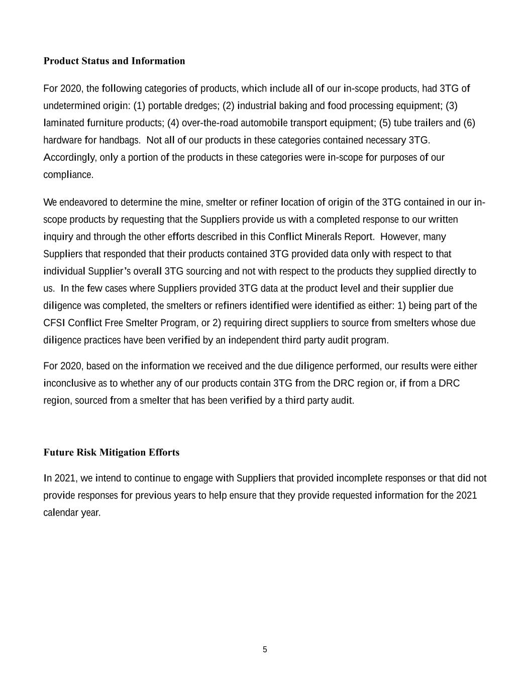 5 Product Status and Information For 2020, the following categories of products, which include all of our in-scope products, had 3TG of undetermined origin: (1) portable dredges; (2) industrial baking and food processing equipment; (3) laminated furniture products; (4) over-the-road automobile transport equipment; (5) tube trailers and (6) hardware for handbags. Not all of our products in these categories contained necessary 3TG. Accordingly, only a portion of the products in these categories were in-scope for purposes of our compliance. We endeavored to determine the mine, smelter or refiner location of origin of the 3TG contained in our in- scope products by requesting that the Suppliers provide us with a completed response to our written inquiry and through the other efforts described in this Conflict Minerals Report. However, many Suppliers that responded that their products contained 3TG provided data only with respect to that individual Supplier’s overall 3TG sourcing and not with respect to the products they supplied directly to us. In the few cases where Suppliers provided 3TG data at the product level and their supplier due diligence was completed, the smelters or refiners identified were identified as either: 1) being part of the CFSI Conflict Free Smelter Program, or 2) requiring direct suppliers to source from smelters whose due diligence practices have been verified by an independent third party audit program. For 2020, based on the information we received and the due diligence performed, our results were either inconclusive as to whether any of our products contain 3TG from the DRC region or, if from a DRC region, sourced from a smelter that has been verified by a third party audit. Future Risk Mitigation Efforts In 2021, we intend to continue to engage with Suppliers that provided incomplete responses or that did not provide responses for previous years to help ensure that they provide requested information for the 2021 calendar year.