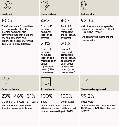 | We maintain independence from our auditor through Audit Committee oversight, a robust regulatory framework in Canada, including the requirement to rotate the lead audit partner at least every five years, and Deloitte's own internal independence procedures which are designed to comply with Chartered Professional Accountants of Ontario and Public Company Accounting Oversight Board (United States) requirements. | 2025 vote: 90.0% support FOR the appointment of Deloitte as our auditor. |