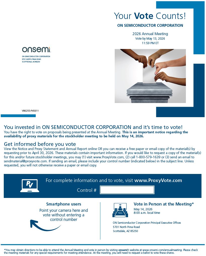 www.ProxyVote.com Control # V86255-P45611 ON SEMICONDUCTOR CORPORATION 2026 Annual Meeting Vote by May 13, 2026 11:59 PM ET ON SEMICONDUCTOR CORPORATION 5701 NORTH PIMA ROAD SCOTTSDALE, AZ 85250 You invested in ON SEMICONDUCTOR