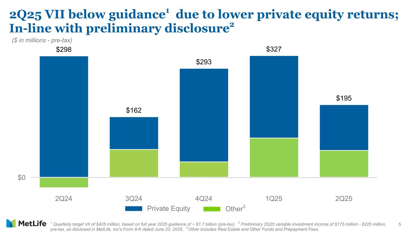 4 1 To be discussed on MetLife, Inc.'s second quarter 2025 earnings conference call and audio webcast. ($ in millions - except per share data) 2Q25 2Q24 % Change % Change (Constant Rate) Key Drivers1 Favorable Unfavorable Group Benefits $400 $533 (25%) Underwriting Margins RIS 368 410 (10%) Investment Margins Asia 350 449 (22%) (22%) Volume Growth Investment Margins; Underwriting Margins Latin America 233 226 3% 15% Volume Growth EMEA 100 77 30% 30% Volume Growth MetLife Holdings 144 153 (6%) Underwriting Margins Investment Margins; Business Run-off Corporate & Other (233) (220) Expense Margins Investment Margins Adjusted Earnings ex. Total Notable Items $1,362 $1,628 (16%) (15%) Adjusted EPS ex. Total Notable Items $2.02 $2.28 (11%) (10%) Adjusted earnings by segment and C&O