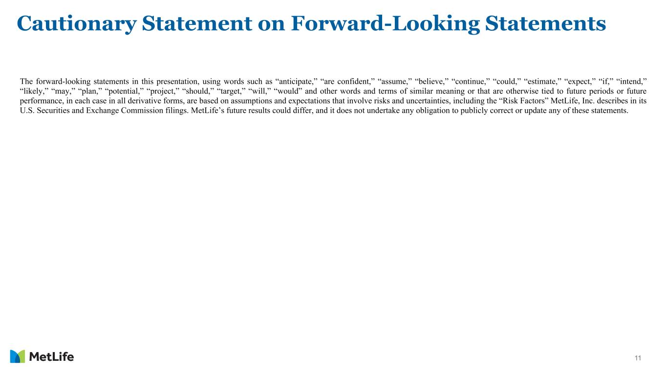 11 Cautionary Statement on Forward-Looking Statements The forward-looking statements in this presentation, using words such as “anticipate,” “are confident,” “assume,” “believe,” “continue,” “could,” “estimate,” “expect,” “if,” “intend,” “likely,” “may,” “plan,” “potential,” “project,” “should,” “target,” “will,” “would” and other words and terms of similar meaning or that are otherwise tied to future periods or future performance, in each case in all derivative forms, are based on assumptions and expectations that involve risks and uncertainties, including the “Risk Factors” MetLife, Inc. describes in its U.S. Securities and Exchange Commission filings. MetLife’s future results could differ, and it does not undertake any obligation to publicly correct or update any of these statements.