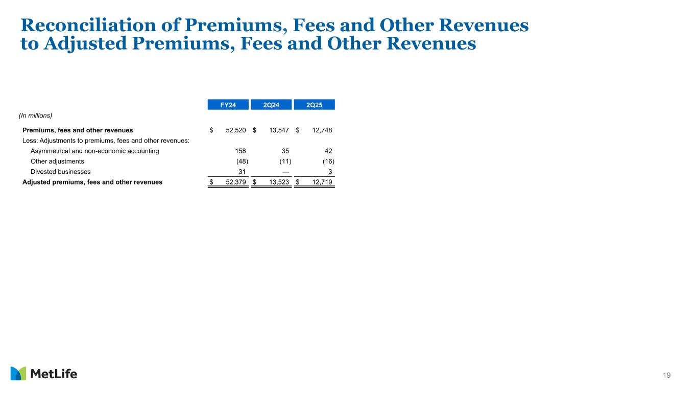 18 Reconciliation to Adjusted Earnings Available to Common Shareholders, Excluding Total Notable Items 2Q25 Group Benefits1 Retirement & Income Solutions1 Asia Latin America EMEA MetLife Holdings1 Corporate & Other1 (In millions) Adjusted earnings available to common shareholders $ 400 $ 368 $ 350 $ 233 $ 100 $ 144 $ (233) Less: Total notable items — — — — — — — Adjusted earnings available to common shareholders, excluding total notable items $ 400 $ 368 $ 350 $ 233 $ 100 $ 144 $ (233) Adjusted earnings available to common shareholders, on a constant currency basis $ 350 $ 233 $ 100 Adjusted earnings available to common shareholders, excluding total notable items, on a constant currency basis $ 350 $ 233 $ 100 2Q24 Group Benefits1 Retirement & Income Solutions1 Asia Latin America EMEA MetLife Holdings1 Corporate & Other1 (In millions) Adjusted earnings available to common shareholders $ 533 $ 410 $ 449 $ 226 $ 77 $ 153 $ (220) Less: Total notable items — — — — — — — Adjusted earnings available to common shareholders, excluding total notable items $ 533 $ 410 $ 449 $ 226 $ 77 $ 153 $ (220) Adjusted earnings available to common shareholders, on a constant currency basis $ 449 $ 203 $ 77 Adjusted earnings available to common shareholders, excluding total notable items, on a constant currency basis $ 449 $ 203 $ 77 1Results on a constant currency basis are not included as constant currency impact is not significant.