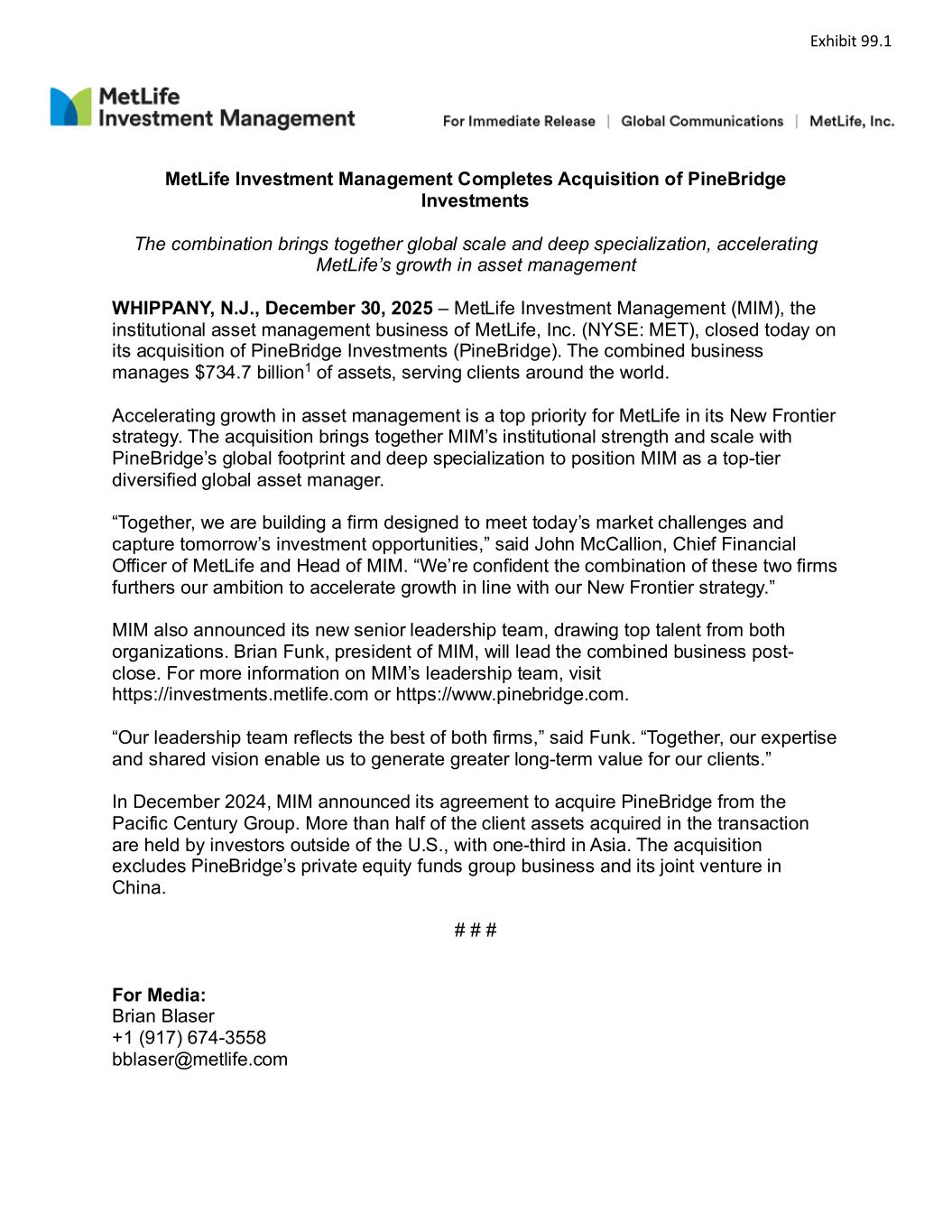MetLife Investment Management Completes Acquisition of PineBridge Investments The combination brings together global scale and deep specialization, accelerating MetLife’s growth in asset management WHIPPANY, N.J., December 30, 2025 – MetLife Investment Management (MIM), the institutional asset management business of MetLife, Inc. (NYSE: MET), closed today on its acquisition of PineBridge Investments (PineBridge). The combined business manages $734.7 billion1 of assets, serving clients around the world. Accelerating growth in asset management is a top priority for MetLife in its New Frontier strategy. The acquisition brings together MIM’s institutional strength and scale with PineBridge’s global footprint and deep specialization to position MIM as a top-tier diversified global asset manager. “Together, we are building a firm designed to meet today’s market challenges and capture tomorrow’s investment opportunities,” said John McCallion, Chief Financial Officer of MetLife and Head of MIM. “We’re confident the combination of these two firms furthers our ambition to accelerate growth in line with our New Frontier strategy.” MIM also announced its new senior leadership team, drawing top talent from both organizations. Brian Funk, president of MIM, will lead the combined business post- close. For more information on MIM’s leadership team, visit https://investments.metlife.com or https://www.pinebridge.com. “Our leadership team reflects the best of both firms,” said Funk. “Together, our expertise and shared vision enable us to generate greater long-term value for our clients.” In December 2024, MIM announced its agreement to acquire PineBridge from the Pacific Century Group. More than half of the client assets acquired in the transaction are held by investors outside of the U.S., with one-third in Asia. The acquisition excludes PineBridge’s private equity funds group business and its joint venture in China. # # # For Media: Brian Blaser +1 (917) 674-3558 bblaser@metlife.com