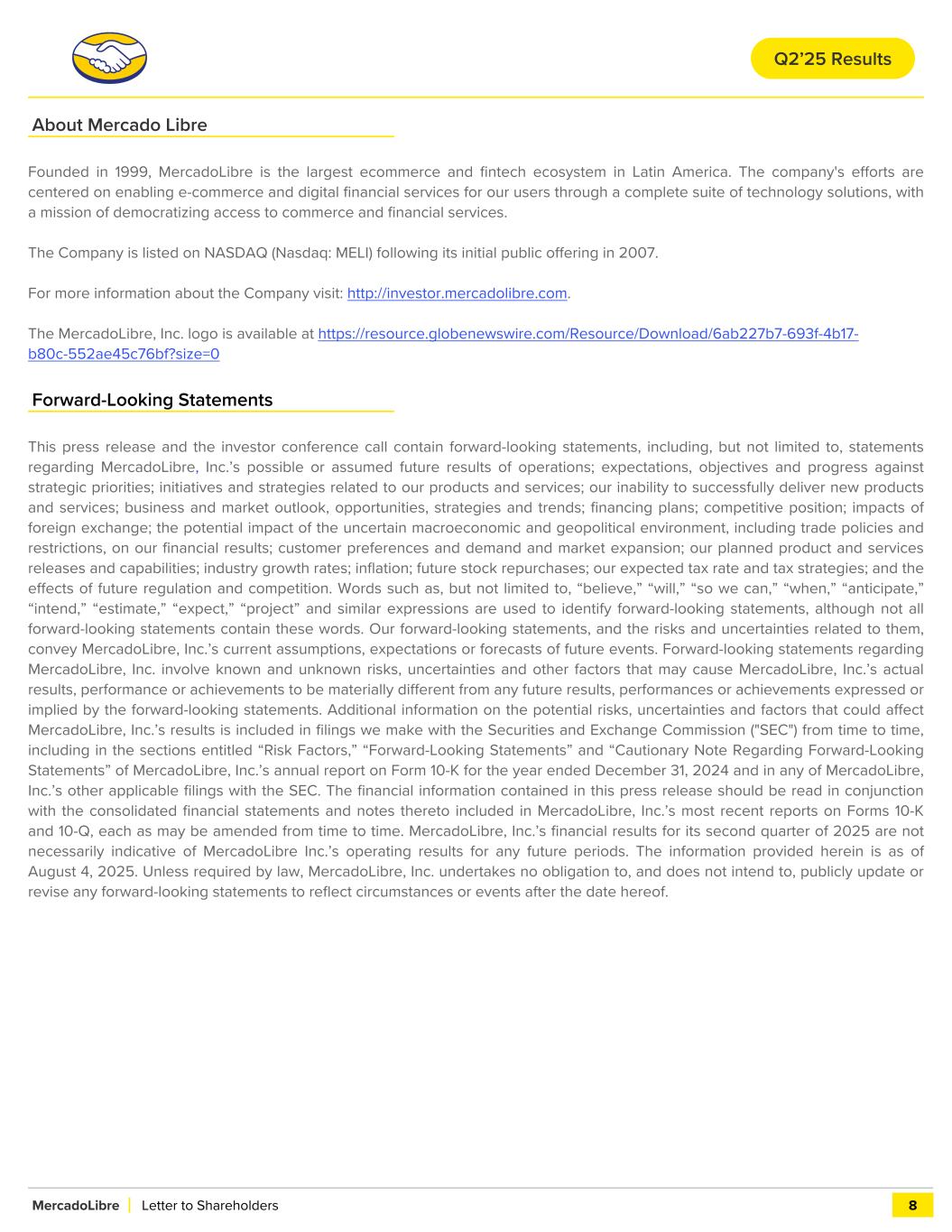 About Mercado Libre Founded in 1999, MercadoLibre is the largest ecommerce and fintech ecosystem in Latin America. The company's efforts are centered on enabling e-commerce and digital financial services for our users through a complete suite of technology solutions, with a mission of democratizing access to commerce and financial services. The Company is listed on NASDAQ (Nasdaq: MELI) following its initial public offering in 2007. For more information about the Company visit: http://investor.mercadolibre.com. The MercadoLibre, Inc. logo is available at https://resource.globenewswire.com/Resource/Download/6ab227b7-693f-4b17- b80c-552ae45c76bf?size=0 Forward-Looking Statements This press release and the investor conference call contain forward-looking statements, including, but not limited to, statements regarding MercadoLibre, Inc.’s possible or assumed future results of operations; expectations, objectives and progress against strategic priorities; initiatives and strategies related to our products and services; our inability to successfully deliver new products and services; business and market outlook, opportunities, strategies and trends; financing plans; competitive position; impacts of foreign exchange; the potential impact of the uncertain macroeconomic and geopolitical environment, including trade policies and restrictions, on our financial results; customer preferences and demand and market expansion; our planned product and services releases and capabilities; industry growth rates; inflation; future stock repurchases; our expected tax rate and tax strategies; and the effects of future regulation and competition. Words such as, but not limited to, “believe,” “will,” “so we can,” “when,” “anticipate,” “intend,” “estimate,” “expect,” “project” and similar expressions are used to identify forward-looking statements, although not all forward-looking statements contain these words. Our forward-looking statements, and the risks and uncertainties related to them, convey MercadoLibre, Inc.’s current assumptions, expectations or forecasts of future events. Forward-looking statements regarding MercadoLibre, Inc. involve known and unknown risks, uncertainties and other factors that may cause MercadoLibre, Inc.’s actual results, performance or achievements to be materially different from any future results, performances or achievements expressed or implied by the forward-looking statements. Additional information on the potential risks, uncertainties and factors that could affect MercadoLibre, Inc.’s results is included in filings we make with the Securities and Exchange Commission ("SEC") from time to time, including in the sections entitled “Risk Factors,” “Forward-Looking Statements” and “Cautionary Note Regarding Forward-Looking Statements” of MercadoLibre, Inc.’s annual report on Form 10-K for the year ended December 31, 2024 and in any of MercadoLibre, Inc.’s other applicable filings with the SEC. The financial information contained in this press release should be read in conjunction with the consolidated financial statements and notes thereto included in MercadoLibre, Inc.’s most recent reports on Forms 10-K and 10-Q, each as may be amended from time to time. MercadoLibre, Inc.’s financial results for its second quarter of 2025 are not necessarily indicative of MercadoLibre Inc.’s operating results for any future periods. The information provided herein is as of August 4, 2025. Unless required by law, MercadoLibre, Inc. undertakes no obligation to, and does not intend to, publicly update or revise any forward-looking statements to reflect circumstances or events after the date hereof. MercadoLibre Letter to Shareholders 8 Q2’25 Results