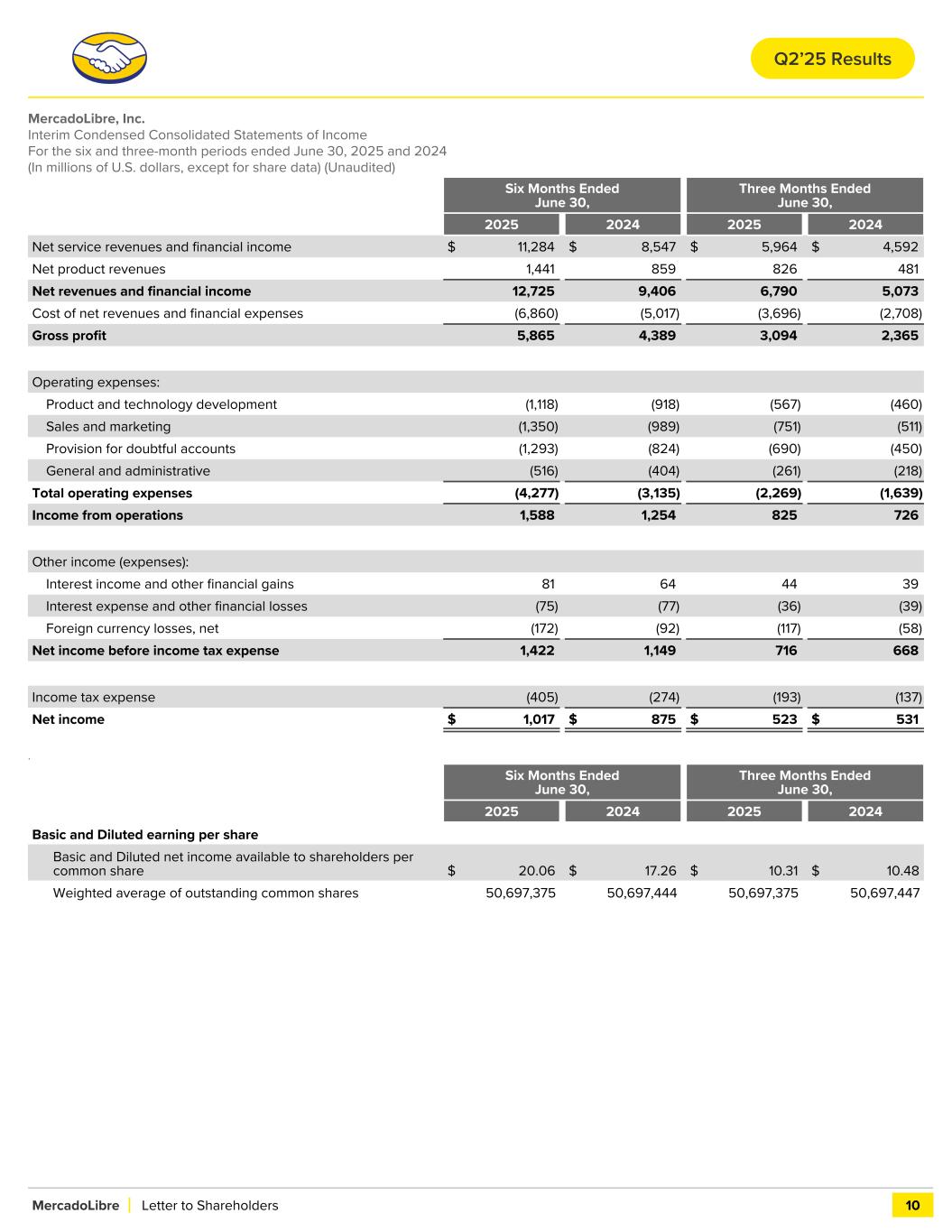 MercadoLibre, Inc. Interim Condensed Consolidated Statements of Income For the six and three-month periods ended June 30, 2025 and 2024 (In millions of U.S. dollars, except for share data) (Unaudited) Six Months Ended June 30, Three Months Ended June 30, 2025 2024 2025 2024 Net service revenues and financial income $ 11,284 $ 8,547 $ 5,964 $ 4,592 Net product revenues 1,441 859 826 481 Net revenues and financial income 12,725 9,406 6,790 5,073 Cost of net revenues and financial expenses (6,860) (5,017) (3,696) (2,708) Gross profit 5,865 4,389 3,094 2,365 Operating expenses: Product and technology development (1,118) (918) (567) (460) Sales and marketing (1,350) (989) (751) (511) Provision for doubtful accounts (1,293) (824) (690) (450) General and administrative (516) (404) (261) (218) Total operating expenses (4,277) (3,135) (2,269) (1,639) Income from operations 1,588 1,254 825 726 Other income (expenses): Interest income and other financial gains 81 64 44 39 Interest expense and other financial losses (75) (77) (36) (39) Foreign currency losses, net (172) (92) (117) (58) Net income before income tax expense 1,422 1,149 716 668 Income tax expense (405) (274) (193) (137) Net income $ 1,017 $ 875 $ 523 $ 531 . Six Months Ended June 30, Three Months Ended June 30, 2025 2024 2025 2024 Basic and Diluted earning per share Basic and Diluted net income available to shareholders per common share $ 20.06 $ 17.26 $ 10.31 $ 10.48 Weighted average of outstanding common shares 50,697,375 50,697,444 50,697,375 50,697,447 MercadoLibre Letter to Shareholders 10 Q2’25 Results