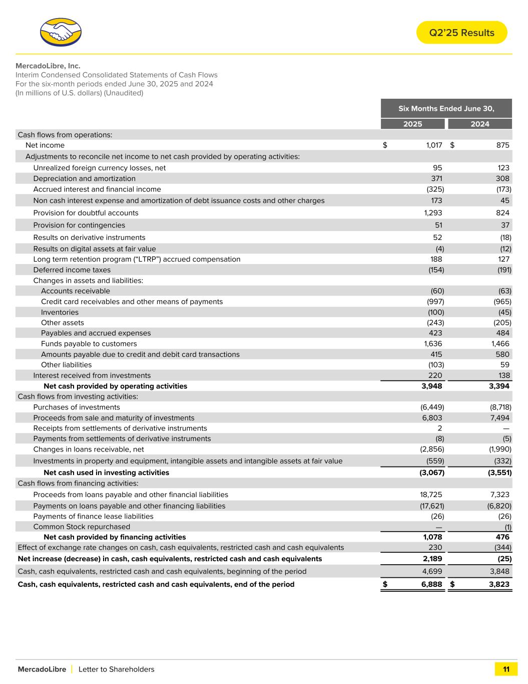 MercadoLibre, Inc. Interim Condensed Consolidated Statements of Cash Flows For the six-month periods ended June 30, 2025 and 2024 (In millions of U.S. dollars) (Unaudited) Six Months Ended June 30, 2025 2024 Cash flows from operations: Net income $ 1,017 $ 875 Adjustments to reconcile net income to net cash provided by operating activities: Unrealized foreign currency losses, net 95 123 Depreciation and amortization 371 308 Accrued interest and financial income (325) (173) Non cash interest expense and amortization of debt issuance costs and other charges 173 45 Provision for doubtful accounts 1,293 824 Provision for contingencies 51 37 Results on derivative instruments 52 (18) Results on digital assets at fair value (4) (12) Long term retention program (“LTRP”) accrued compensation 188 127 Deferred income taxes (154) (191) Changes in assets and liabilities: Accounts receivable (60) (63) Credit card receivables and other means of payments (997) (965) Inventories (100) (45) Other assets (243) (205) Payables and accrued expenses 423 484 Funds payable to customers 1,636 1,466 Amounts payable due to credit and debit card transactions 415 580 Other liabilities (103) 59 Interest received from investments 220 138 Net cash provided by operating activities 3,948 3,394 Cash flows from investing activities: Purchases of investments (6,449) (8,718) Proceeds from sale and maturity of investments 6,803 7,494 Receipts from settlements of derivative instruments 2 — Payments from settlements of derivative instruments (8) (5) Changes in loans receivable, net (2,856) (1,990) Investments in property and equipment, intangible assets and intangible assets at fair value (559) (332) Net cash used in investing activities (3,067) (3,551) Cash flows from financing activities: Proceeds from loans payable and other financial liabilities 18,725 7,323 Payments on loans payable and other financing liabilities (17,621) (6,820) Payments of finance lease liabilities (26) (26) Common Stock repurchased — (1) Net cash provided by financing activities 1,078 476 Effect of exchange rate changes on cash, cash equivalents, restricted cash and cash equivalents 230 (344) Net increase (decrease) in cash, cash equivalents, restricted cash and cash equivalents 2,189 (25) Cash, cash equivalents, restricted cash and cash equivalents, beginning of the period 4,699 3,848 Cash, cash equivalents, restricted cash and cash equivalents, end of the period $ 6,888 $ 3,823 MercadoLibre Letter to Shareholders 11 Q2’25 Results