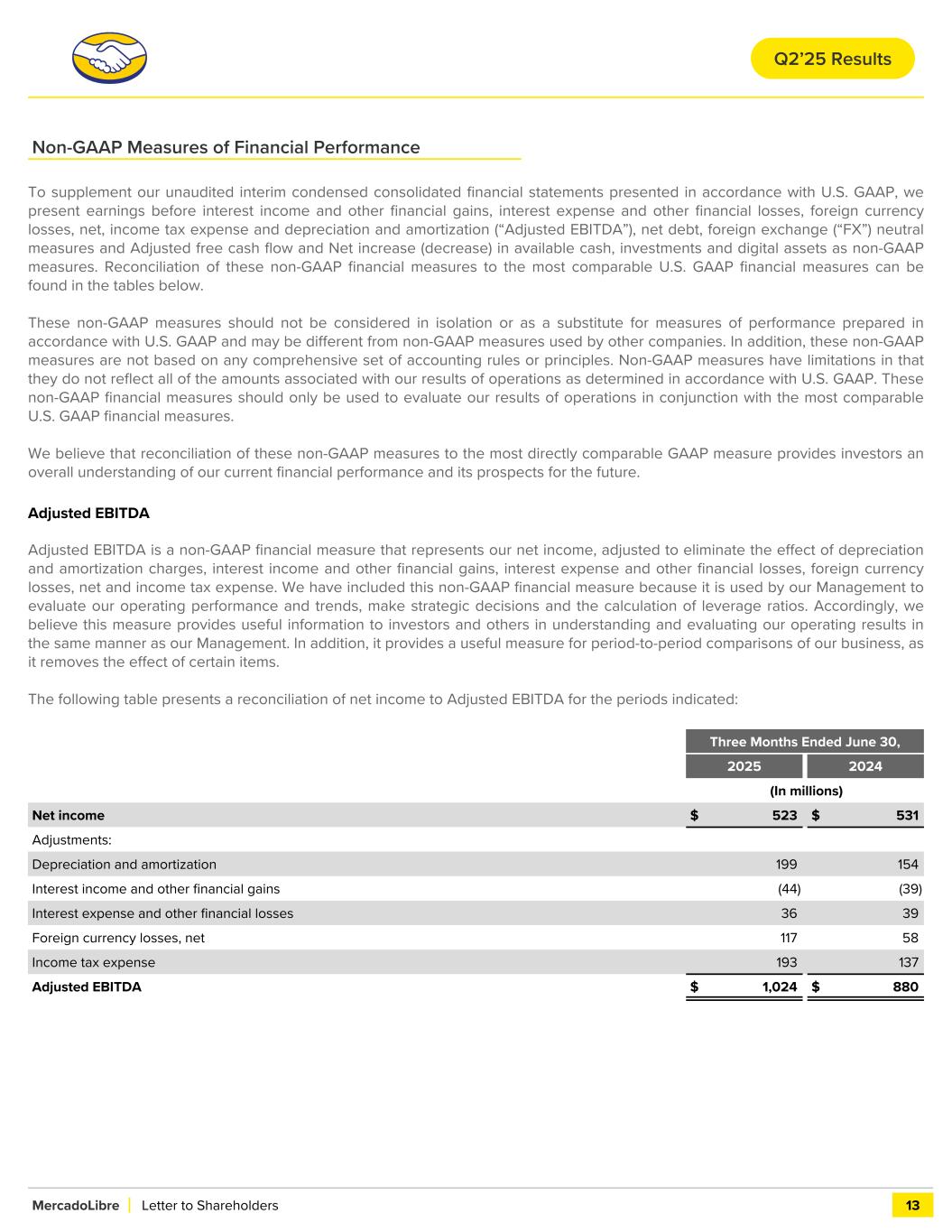 Non-GAAP Measures of Financial Performance To supplement our unaudited interim condensed consolidated financial statements presented in accordance with U.S. GAAP, we present earnings before interest income and other financial gains, interest expense and other financial losses, foreign currency losses, net, income tax expense and depreciation and amortization (“Adjusted EBITDA”), net debt, foreign exchange (“FX”) neutral measures and Adjusted free cash flow and Net increase (decrease) in available cash, investments and digital assets as non-GAAP measures. Reconciliation of these non-GAAP financial measures to the most comparable U.S. GAAP financial measures can be found in the tables below. These non-GAAP measures should not be considered in isolation or as a substitute for measures of performance prepared in accordance with U.S. GAAP and may be different from non-GAAP measures used by other companies. In addition, these non-GAAP measures are not based on any comprehensive set of accounting rules or principles. Non-GAAP measures have limitations in that they do not reflect all of the amounts associated with our results of operations as determined in accordance with U.S. GAAP. These non-GAAP financial measures should only be used to evaluate our results of operations in conjunction with the most comparable U.S. GAAP financial measures. We believe that reconciliation of these non-GAAP measures to the most directly comparable GAAP measure provides investors an overall understanding of our current financial performance and its prospects for the future. Adjusted EBITDA Adjusted EBITDA is a non-GAAP financial measure that represents our net income, adjusted to eliminate the effect of depreciation and amortization charges, interest income and other financial gains, interest expense and other financial losses, foreign currency losses, net and income tax expense. We have included this non-GAAP financial measure because it is used by our Management to evaluate our operating performance and trends, make strategic decisions and the calculation of leverage ratios. Accordingly, we believe this measure provides useful information to investors and others in understanding and evaluating our operating results in the same manner as our Management. In addition, it provides a useful measure for period-to-period comparisons of our business, as it removes the effect of certain items. The following table presents a reconciliation of net income to Adjusted EBITDA for the periods indicated: Three Months Ended June 30, 2025 2024 (In millions) Net income $ 523 $ 531 Adjustments: Depreciation and amortization 199 154 Interest income and other financial gains (44) (39) Interest expense and other financial losses 36 39 Foreign currency losses, net 117 58 Income tax expense 193 137 Adjusted EBITDA $ 1,024 $ 880 MercadoLibre Letter to Shareholders 13 Q2’25 Results