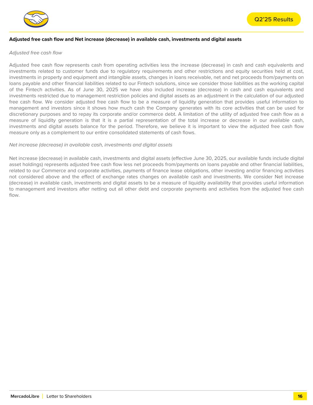 Adjusted free cash flow and Net increase (decrease) in available cash, investments and digital assets Adjusted free cash flow Adjusted free cash flow represents cash from operating activities less the increase (decrease) in cash and cash equivalents and investments related to customer funds due to regulatory requirements and other restrictions and equity securities held at cost, investments in property and equipment and intangible assets, changes in loans receivable, net and net proceeds from/payments on loans payable and other financial liabilities related to our Fintech solutions, since we consider those liabilities as the working capital of the Fintech activities. As of June 30, 2025 we have also included increase (decrease) in cash and cash equivalents and investments restricted due to management restriction policies and digital assets as an adjustment in the calculation of our adjusted free cash flow. We consider adjusted free cash flow to be a measure of liquidity generation that provides useful information to management and investors since it shows how much cash the Company generates with its core activities that can be used for discretionary purposes and to repay its corporate and/or commerce debt. A limitation of the utility of adjusted free cash flow as a measure of liquidity generation is that it is a partial representation of the total increase or decrease in our available cash, investments and digital assets balance for the period. Therefore, we believe it is important to view the adjusted free cash flow measure only as a complement to our entire consolidated statements of cash flows. Net increase (decrease) in available cash, investments and digital assets Net increase (decrease) in available cash, investments and digital assets (effective June 30, 2025, our available funds include digital asset holdings) represents adjusted free cash flow less net proceeds from/payments on loans payable and other financial liabilities, related to our Commerce and corporate activities, payments of finance lease obligations, other investing and/or financing activities not considered above and the effect of exchange rates changes on available cash and investments. We consider Net increase (decrease) in available cash, investments and digital assets to be a measure of liquidity availability that provides useful information to management and investors after netting out all other debt and corporate payments and activities from the adjusted free cash flow. MercadoLibre Letter to Shareholders 16 Q2’25 Results
