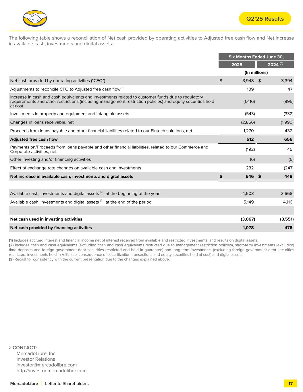 The following table shows a reconciliation of Net cash provided by operating activities to Adjusted free cash flow and Net increase in available cash, investments and digital assets: Six Months Ended June 30, 2025 2024 (3) (In millions) Net cash provided by operating activities ("CFO") $ 3,948 $ 3,394 Adjustments to reconcile CFO to Adjusted free cash flow (1) 109 47 Increase in cash and cash equivalents and investments related to customer funds due to regulatory requirements and other restrictions (including management restriction policies) and equity securities held at cost (1,416) (895) Investments in property and equipment and intangible assets (543) (332) Changes in loans receivable, net (2,856) (1,990) Proceeds from loans payable and other financial liabilities related to our Fintech solutions, net 1,270 432 Adjusted free cash flow 512 656 Payments on/Proceeds from loans payable and other financial liabilities, related to our Commerce and Corporate activities, net (192) 45 Other investing and/or financing activities (6) (6) Effect of exchange rate changes on available cash and investments 232 (247) Net increase in available cash, investments and digital assets $ 546 $ 448 Available cash, investments and digital assets (2), at the beginning of the year 4,603 3,668 Available cash, investments and digital assets (2), at the end of the period 5,149 4,116 Net cash used in investing activities (3,067) (3,551) Net cash provided by financing activities 1,078 476 (1) Includes accrued interest and financial income net of interest received from available and restricted investments, and results on digital assets. (2) Includes cash and cash equivalents (excluding cash and cash equivalents restricted due to management restriction policies), short-term investments (excluding time deposits and foreign government debt securities restricted and held in guarantee) and long-term investments (excluding foreign government debt securities restricted, investments held in VIEs as a consequence of securitization transactions and equity securities held at cost) and digital assets. (3) Recast for consistency with the current presentation due to the changes explained above. > CONTACT: MercadoLibre, Inc. Investor Relations investor@mercadolibre.com http://investor.mercadolibre.com MercadoLibre Letter to Shareholders 17 Q2’25 Results