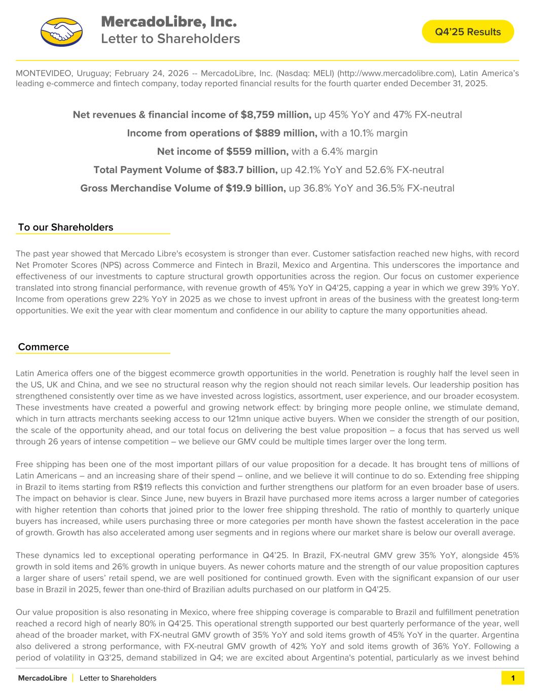 MONTEVIDEO, Uruguay; February 24, 2026 -- MercadoLibre, Inc. (Nasdaq: MELI) (http://www.mercadolibre.com), Latin America’s leading e-commerce and fintech company, today reported financial results for the fourth quarter ended December 31, 2025. Net revenues & financial income of $8,759 million, up 45% YoY and 47% FX-neutral Income from operations of $889 million, with a 10.1% margin Net income of $559 million, with a 6.4% margin Total Payment Volume of $83.7 billion, up 42.1% YoY and 52.6% FX-neutral Gross Merchandise Volume of $19.9 billion, up 36.8% YoY and 36.5% FX-neutral To our Shareholders The past year showed that Mercado Libre's ecosystem is stronger than ever. Customer satisfaction reached new highs, with record Net Promoter Scores (NPS) across Commerce and Fintech in Brazil, Mexico and Argentina. This underscores the importance and effectiveness of our investments to capture structural growth opportunities across the region. Our focus on customer experience translated into strong financial performance, with revenue growth of 45% YoY in Q4'25, capping a year in which we grew 39% YoY. Income from operations grew 22% YoY in 2025 as we chose to invest upfront in areas of the business with the greatest long-term opportunities. We exit the year with clear momentum and confidence in our ability to capture the many opportunities ahead. Commerce Latin America offers one of the biggest ecommerce growth opportunities in the world. Penetration is roughly half the level seen in the US, UK and China, and we see no structural reason why the region should not reach similar levels. Our leadership position has strengthened consistently over time as we have invested across logistics, assortment, user experience, and our broader ecosystem. These investments have created a powerful and growing network effect: by bringing more people online, we stimulate demand, which in turn attracts merchants seeking access to our 121mn unique active buyers. When we consider the strength of our position, the scale of the opportunity ahead, and our total focus on delivering the best value proposition – a focus that has served us well through 26 years of intense competition – we believe our GMV could be multiple times larger over the long term. Free shipping has been one of the most important pillars of our value proposition for a decade. It has brought tens of millions of Latin Americans – and an increasing share of their spend – online, and we believe it will continue to do so. Extending free shipping in Brazil to items starting from R$19 reflects this conviction and further strengthens our platform for an even broader base of users. The impact on behavior is clear. Since June, new buyers in Brazil have purchased more items across a larger number of categories with higher retention than cohorts that joined prior to the lower free shipping threshold. The ratio of monthly to quarterly unique buyers has increased, while users purchasing three or more categories per month have shown the fastest acceleration in the pace of growth. Growth has also accelerated among user segments and in regions where our market share is below our overall average. These dynamics led to exceptional operating performance in Q4’25. In Brazil, FX-neutral GMV grew 35% YoY, alongside 45% growth in sold items and 26% growth in unique buyers. As newer cohorts mature and the strength of our value proposition captures a larger share of users’ retail spend, we are well positioned for continued growth. Even with the significant expansion of our user base in Brazil in 2025, fewer than one-third of Brazilian adults purchased on our platform in Q4'25. Our value proposition is also resonating in Mexico, where free shipping coverage is comparable to Brazil and fulfillment penetration reached a record high of nearly 80% in Q4'25. This operational strength supported our best quarterly performance of the year, well ahead of the broader market, with FX-neutral GMV growth of 35% YoY and sold items growth of 45% YoY in the quarter. Argentina also delivered a strong performance, with FX-neutral GMV growth of 42% YoY and sold items growth of 36% YoY. Following a period of volatility in Q3'25, demand stabilized in Q4; we are excited about Argentina's potential, particularly as we invest behind MercadoLibre, Inc. Letter to Shareholders MercadoLibre Letter to Shareholders 1 Q4’25 Results