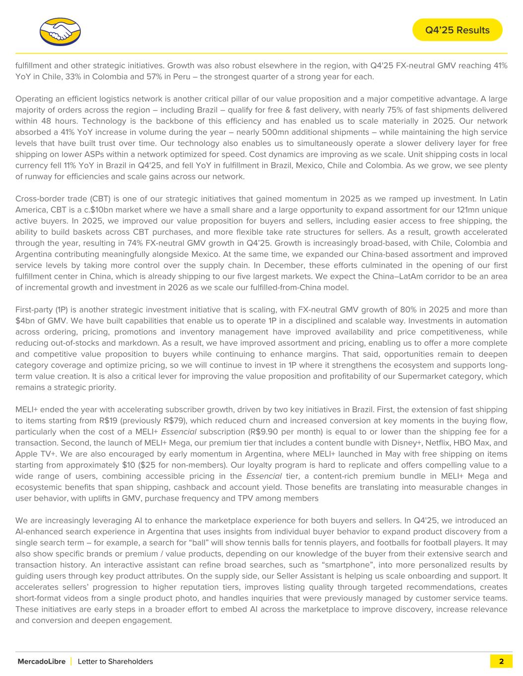 fulfillment and other strategic initiatives. Growth was also robust elsewhere in the region, with Q4'25 FX-neutral GMV reaching 41% YoY in Chile, 33% in Colombia and 57% in Peru – the strongest quarter of a strong year for each. Operating an efficient logistics network is another critical pillar of our value proposition and a major competitive advantage. A large majority of orders across the region – including Brazil – qualify for free & fast delivery, with nearly 75% of fast shipments delivered within 48 hours. Technology is the backbone of this efficiency and has enabled us to scale materially in 2025. Our network absorbed a 41% YoY increase in volume during the year – nearly 500mn additional shipments – while maintaining the high service levels that have built trust over time. Our technology also enables us to simultaneously operate a slower delivery layer for free shipping on lower ASPs within a network optimized for speed. Cost dynamics are improving as we scale. Unit shipping costs in local currency fell 11% YoY in Brazil in Q4'25, and fell YoY in fulfillment in Brazil, Mexico, Chile and Colombia. As we grow, we see plenty of runway for efficiencies and scale gains across our network. Cross-border trade (CBT) is one of our strategic initiatives that gained momentum in 2025 as we ramped up investment. In Latin America, CBT is a c.$10bn market where we have a small share and a large opportunity to expand assortment for our 121mn unique active buyers. In 2025, we improved our value proposition for buyers and sellers, including easier access to free shipping, the ability to build baskets across CBT purchases, and more flexible take rate structures for sellers. As a result, growth accelerated through the year, resulting in 74% FX-neutral GMV growth in Q4’25. Growth is increasingly broad-based, with Chile, Colombia and Argentina contributing meaningfully alongside Mexico. At the same time, we expanded our China-based assortment and improved service levels by taking more control over the supply chain. In December, these efforts culminated in the opening of our first fulfillment center in China, which is already shipping to our five largest markets. We expect the China–LatAm corridor to be an area of incremental growth and investment in 2026 as we scale our fulfilled-from-China model. First-party (1P) is another strategic investment initiative that is scaling, with FX-neutral GMV growth of 80% in 2025 and more than $4bn of GMV. We have built capabilities that enable us to operate 1P in a disciplined and scalable way. Investments in automation across ordering, pricing, promotions and inventory management have improved availability and price competitiveness, while reducing out-of-stocks and markdown. As a result, we have improved assortment and pricing, enabling us to offer a more complete and competitive value proposition to buyers while continuing to enhance margins. That said, opportunities remain to deepen category coverage and optimize pricing, so we will continue to invest in 1P where it strengthens the ecosystem and supports long- term value creation. It is also a critical lever for improving the value proposition and profitability of our Supermarket category, which remains a strategic priority. MELI+ ended the year with accelerating subscriber growth, driven by two key initiatives in Brazil. First, the extension of fast shipping to items starting from R$19 (previously R$79), which reduced churn and increased conversion at key moments in the buying flow, particularly when the cost of a MELI+ Essencial subscription (R$9.90 per month) is equal to or lower than the shipping fee for a transaction. Second, the launch of MELI+ Mega, our premium tier that includes a content bundle with Disney+, Netflix, HBO Max, and Apple TV+. We are also encouraged by early momentum in Argentina, where MELI+ launched in May with free shipping on items starting from approximately $10 ($25 for non-members). Our loyalty program is hard to replicate and offers compelling value to a wide range of users, combining accessible pricing in the Essencial tier, a content-rich premium bundle in MELI+ Mega and ecosystemic benefits that span shipping, cashback and account yield. Those benefits are translating into measurable changes in user behavior, with uplifts in GMV, purchase frequency and TPV among members We are increasingly leveraging AI to enhance the marketplace experience for both buyers and sellers. In Q4'25, we introduced an AI-enhanced search experience in Argentina that uses insights from individual buyer behavior to expand product discovery from a single search term – for example, a search for “ball” will show tennis balls for tennis players, and footballs for football players. It may also show specific brands or premium / value products, depending on our knowledge of the buyer from their extensive search and transaction history. An interactive assistant can refine broad searches, such as “smartphone”, into more personalized results by guiding users through key product attributes. On the supply side, our Seller Assistant is helping us scale onboarding and support. It accelerates sellers’ progression to higher reputation tiers, improves listing quality through targeted recommendations, creates short-format videos from a single product photo, and handles inquiries that were previously managed by customer service teams. These initiatives are early steps in a broader effort to embed AI across the marketplace to improve discovery, increase relevance and conversion and deepen engagement. MercadoLibre Letter to Shareholders 2 Q4’25 Results