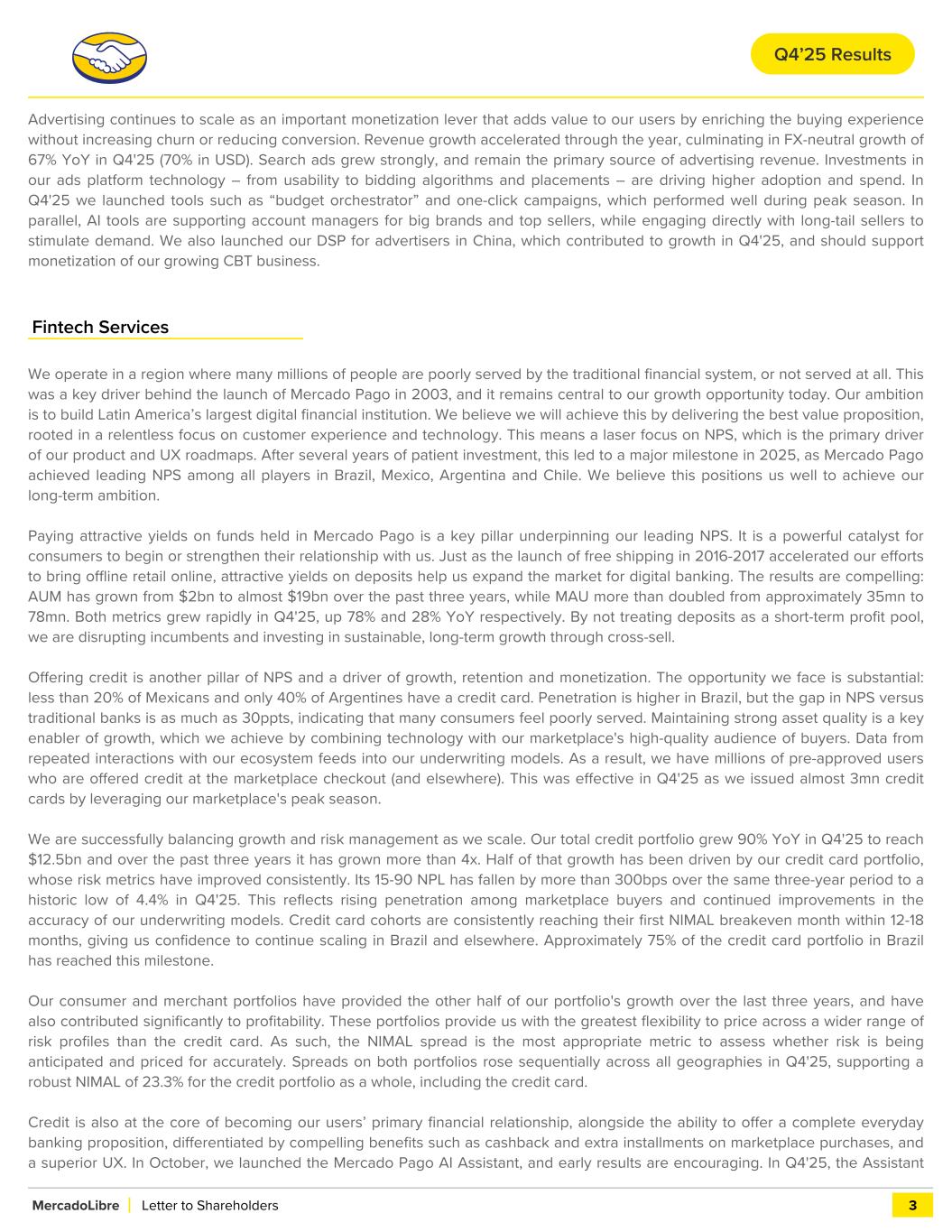 Advertising continues to scale as an important monetization lever that adds value to our users by enriching the buying experience without increasing churn or reducing conversion. Revenue growth accelerated through the year, culminating in FX-neutral growth of 67% YoY in Q4'25 (70% in USD). Search ads grew strongly, and remain the primary source of advertising revenue. Investments in our ads platform technology – from usability to bidding algorithms and placements – are driving higher adoption and spend. In Q4'25 we launched tools such as “budget orchestrator” and one-click campaigns, which performed well during peak season. In parallel, AI tools are supporting account managers for big brands and top sellers, while engaging directly with long-tail sellers to stimulate demand. We also launched our DSP for advertisers in China, which contributed to growth in Q4'25, and should support monetization of our growing CBT business. Fintech Services We operate in a region where many millions of people are poorly served by the traditional financial system, or not served at all. This was a key driver behind the launch of Mercado Pago in 2003, and it remains central to our growth opportunity today. Our ambition is to build Latin America’s largest digital financial institution. We believe we will achieve this by delivering the best value proposition, rooted in a relentless focus on customer experience and technology. This means a laser focus on NPS, which is the primary driver of our product and UX roadmaps. After several years of patient investment, this led to a major milestone in 2025, as Mercado Pago achieved leading NPS among all players in Brazil, Mexico, Argentina and Chile. We believe this positions us well to achieve our long-term ambition. Paying attractive yields on funds held in Mercado Pago is a key pillar underpinning our leading NPS. It is a powerful catalyst for consumers to begin or strengthen their relationship with us. Just as the launch of free shipping in 2016-2017 accelerated our efforts to bring offline retail online, attractive yields on deposits help us expand the market for digital banking. The results are compelling: AUM has grown from $2bn to almost $19bn over the past three years, while MAU more than doubled from approximately 35mn to 78mn. Both metrics grew rapidly in Q4'25, up 78% and 28% YoY respectively. By not treating deposits as a short-term profit pool, we are disrupting incumbents and investing in sustainable, long-term growth through cross-sell. Offering credit is another pillar of NPS and a driver of growth, retention and monetization. The opportunity we face is substantial: less than 20% of Mexicans and only 40% of Argentines have a credit card. Penetration is higher in Brazil, but the gap in NPS versus traditional banks is as much as 30ppts, indicating that many consumers feel poorly served. Maintaining strong asset quality is a key enabler of growth, which we achieve by combining technology with our marketplace's high-quality audience of buyers. Data from repeated interactions with our ecosystem feeds into our underwriting models. As a result, we have millions of pre-approved users who are offered credit at the marketplace checkout (and elsewhere). This was effective in Q4'25 as we issued almost 3mn credit cards by leveraging our marketplace's peak season. We are successfully balancing growth and risk management as we scale. Our total credit portfolio grew 90% YoY in Q4'25 to reach $12.5bn and over the past three years it has grown more than 4x. Half of that growth has been driven by our credit card portfolio, whose risk metrics have improved consistently. Its 15-90 NPL has fallen by more than 300bps over the same three-year period to a historic low of 4.4% in Q4'25. This reflects rising penetration among marketplace buyers and continued improvements in the accuracy of our underwriting models. Credit card cohorts are consistently reaching their first NIMAL breakeven month within 12-18 months, giving us confidence to continue scaling in Brazil and elsewhere. Approximately 75% of the credit card portfolio in Brazil has reached this milestone. Our consumer and merchant portfolios have provided the other half of our portfolio's growth over the last three years, and have also contributed significantly to profitability. These portfolios provide us with the greatest flexibility to price across a wider range of risk profiles than the credit card. As such, the NIMAL spread is the most appropriate metric to assess whether risk is being anticipated and priced for accurately. Spreads on both portfolios rose sequentially across all geographies in Q4'25, supporting a robust NIMAL of 23.3% for the credit portfolio as a whole, including the credit card. Credit is also at the core of becoming our users’ primary financial relationship, alongside the ability to offer a complete everyday banking proposition, differentiated by compelling benefits such as cashback and extra installments on marketplace purchases, and a superior UX. In October, we launched the Mercado Pago AI Assistant, and early results are encouraging. In Q4'25, the Assistant MercadoLibre Letter to Shareholders 3 Q4’25 Results