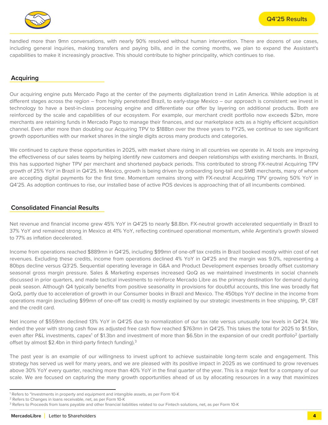 handled more than 9mn conversations, with nearly 90% resolved without human intervention. There are dozens of use cases, including general inquiries, making transfers and paying bills, and in the coming months, we plan to expand the Assistant's capabilities to make it increasingly proactive. This should contribute to higher principality, which continues to rise. Acquiring Our acquiring engine puts Mercado Pago at the center of the payments digitalization trend in Latin America. While adoption is at different stages across the region – from highly penetrated Brazil, to early-stage Mexico – our approach is consistent: we invest in technology to have a best-in-class processing engine and differentiate our offer by layering on additional products. Both are reinforced by the scale and capabilities of our ecosystem. For example, our merchant credit portfolio now exceeds $2bn, more merchants are retaining funds in Mercado Pago to manage their finances, and our marketplace acts as a highly efficient acquisition channel. Even after more than doubling our Acquiring TPV to $188bn over the three years to FY25, we continue to see significant growth opportunities with our market shares in the single digits across many products and categories. We continued to capture these opportunities in 2025, with market share rising in all countries we operate in. AI tools are improving the effectiveness of our sales teams by helping identify new customers and deepen relationships with existing merchants. In Brazil, this has supported higher TPV per merchant and shortened payback periods. This contributed to strong FX-neutral Acquiring TPV growth of 25% YoY in Brazil in Q4'25. In Mexico, growth is being driven by onboarding long-tail and SMB merchants, many of whom are accepting digital payments for the first time. Momentum remains strong with FX-neutral Acquiring TPV growing 50% YoY in Q4’25. As adoption continues to rise, our installed base of active POS devices is approaching that of all incumbents combined. Consolidated Financial Results Net revenue and financial income grew 45% YoY in Q4'25 to nearly $8.8bn. FX-neutral growth accelerated sequentially in Brazil to 37% YoY and remained strong in Mexico at 41% YoY, reflecting continued operational momentum, while Argentina's growth slowed to 77% as inflation decelerated. Income from operations reached $889mn in Q4'25, including $99mn of one-off tax credits in Brazil booked mostly within cost of net revenues. Excluding these credits, income from operations declined 4% YoY in Q4'25 and the margin was 9.0%, representing a 80bps decline versus Q3'25. Sequential operating leverage in G&A and Product Development expenses broadly offset customary seasonal gross margin pressure. Sales & Marketing expenses increased QoQ as we maintained investments in social channels discussed in prior quarters, and made tactical investments to reinforce Mercado Libre as the primary destination for demand during peak season. Although Q4 typically benefits from positive seasonality in provisions for doubtful accounts, this line was broadly flat QoQ, partly due to acceleration of growth in our Consumer books in Brazil and Mexico. The 450bps YoY decline in the income from operations margin (excluding $99mn of one-off tax credit) is mostly explained by our strategic investments in free shipping, 1P, CBT and the credit card. Net income of $559mn declined 13% YoY in Q4'25 due to normalization of our tax rate versus unusually low levels in Q4'24. We ended the year with strong cash flow as adjusted free cash flow reached $763mn in Q4'25. This takes the total for 2025 to $1.5bn, even after P&L investments, capex1 of $1.3bn and investment of more than $6.5bn in the expansion of our credit portfolio2 (partially offset by almost $2.4bn in third-party fintech funding).3 The past year is an example of our willingness to invest upfront to achieve sustainable long-term scale and engagement. This strategy has served us well for many years, and we are pleased with its positive impact in 2025 as we continued to grow revenues above 30% YoY every quarter, reaching more than 40% YoY in the final quarter of the year. This is a major feat for a company of our scale. We are focused on capturing the many growth opportunities ahead of us by allocating resources in a way that maximizes MercadoLibre Letter to Shareholders 4 1 Refers to “Investments in property and equipment and intangible assets, as per Form 10-K 2 Refers to Changes in loans receivable, net, as per Form 10-K 3 Refers to Proceeds from loans payable and other financial liabilities related to our Fintech solutions, net, as per Form 10-K Q4’25 Results