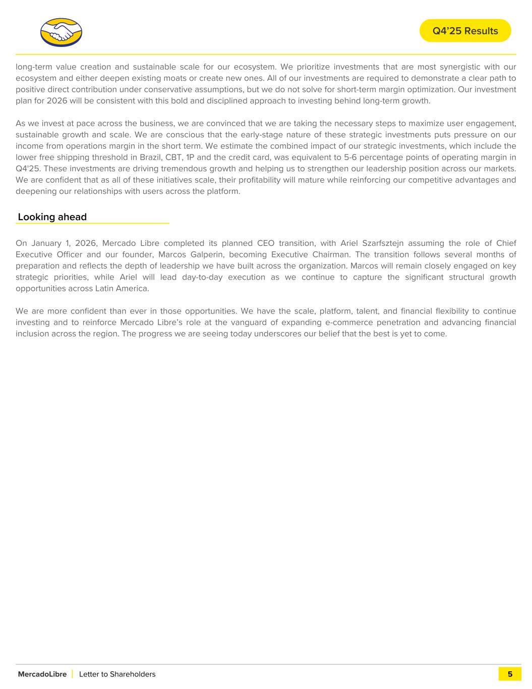 long-term value creation and sustainable scale for our ecosystem. We prioritize investments that are most synergistic with our ecosystem and either deepen existing moats or create new ones. All of our investments are required to demonstrate a clear path to positive direct contribution under conservative assumptions, but we do not solve for short-term margin optimization. Our investment plan for 2026 will be consistent with this bold and disciplined approach to investing behind long-term growth. As we invest at pace across the business, we are convinced that we are taking the necessary steps to maximize user engagement, sustainable growth and scale. We are conscious that the early-stage nature of these strategic investments puts pressure on our income from operations margin in the short term. We estimate the combined impact of our strategic investments, which include the lower free shipping threshold in Brazil, CBT, 1P and the credit card, was equivalent to 5-6 percentage points of operating margin in Q4'25. These investments are driving tremendous growth and helping us to strengthen our leadership position across our markets. We are confident that as all of these initiatives scale, their profitability will mature while reinforcing our competitive advantages and deepening our relationships with users across the platform. Looking ahead On January 1, 2026, Mercado Libre completed its planned CEO transition, with Ariel Szarfsztejn assuming the role of Chief Executive Officer and our founder, Marcos Galperin, becoming Executive Chairman. The transition follows several months of preparation and reflects the depth of leadership we have built across the organization. Marcos will remain closely engaged on key strategic priorities, while Ariel will lead day-to-day execution as we continue to capture the significant structural growth opportunities across Latin America. We are more confident than ever in those opportunities. We have the scale, platform, talent, and financial flexibility to continue investing and to reinforce Mercado Libre’s role at the vanguard of expanding e-commerce penetration and advancing financial inclusion across the region. The progress we are seeing today underscores our belief that the best is yet to come. MercadoLibre Letter to Shareholders 5 Q4’25 Results