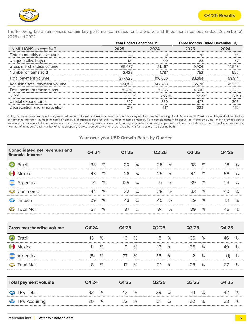 The following table summarizes certain key performance metrics for the twelve and three-month periods ended December 31, 2025 and 2024: (1) Figures have been calculated using rounded amounts. Growth calculations based on this table may not total due to rounding. As of December 31, 2024, we no longer disclose the key performance indicator "Number of items shipped". Management believes that "Number of items shipped", as a complementary disclosure to "items sold", no longer provides useful information to investors to better understand our business. Following years of investment, our logistics network currently ships almost all items sold. As such, the two performance metrics, "Number of items sold" and "Number of items shipped", have converged so we no longer see a benefit for investors in disclosing both. Year-over-year USD Growth Rates by Quarter Consolidated net revenues and financial income Q4’24 Q1’25 Q2’25 Q3’25 Q4’25 Brazil 38 % 20 % 25 % 38 % 48 % Mexico 43 % 26 % 25 % 44 % 56 % Argentina 31 % 125 % 77 % 39 % 23 % Commerce 44 % 32 % 29 % 33 % 40 % Fintech 29 % 43 % 40 % 49 % 51 % Total Meli 37 % 37 % 34 % 39 % 45 % Gross merchandise volume Q4’24 Q1’25 Q2’25 Q3’25 Q4’25 Brazil 13 % 10 % 18 % 36 % 46 % Mexico 11 % 2 % 16 % 36 % 49 % Argentina (5) % 77 % 35 % 2 % (1) % Total Meli 8 % 17 % 21 % 28 % 37 % Total payment volume Q4’24 Q1’25 Q2’25 Q3’25 Q4’25 TPV Total 33 % 43 % 39 % 41 % 42 % TPV Acquiring 20 % 32 % 31 % 32 % 33 % MercadoLibre Letter to Shareholders 6 Year Ended December 31, Three Months Ended December 31, (IN MILLIONS, except %) (1) 2025 2024 2025 2024 Fintech monthly active users 78 61 78 61 Unique active buyers 121 100 83 67 Gross merchandise volume 65,037 51,467 19,906 14,548 Number of items sold 2,429 1,787 752 525 Total payment volume 277,823 196,660 83,694 58,914 Acquiring total payment volume 188,105 142,200 55,711 41,833 Total payment transactions 15,470 11,355 4,506 3,325 NIMAL 22.4 % 28.2 % 23.3 % 27.6 % Capital expenditures 1,327 860 427 305 Depreciation and amortization 818 617 238 152 Q4’25 Results