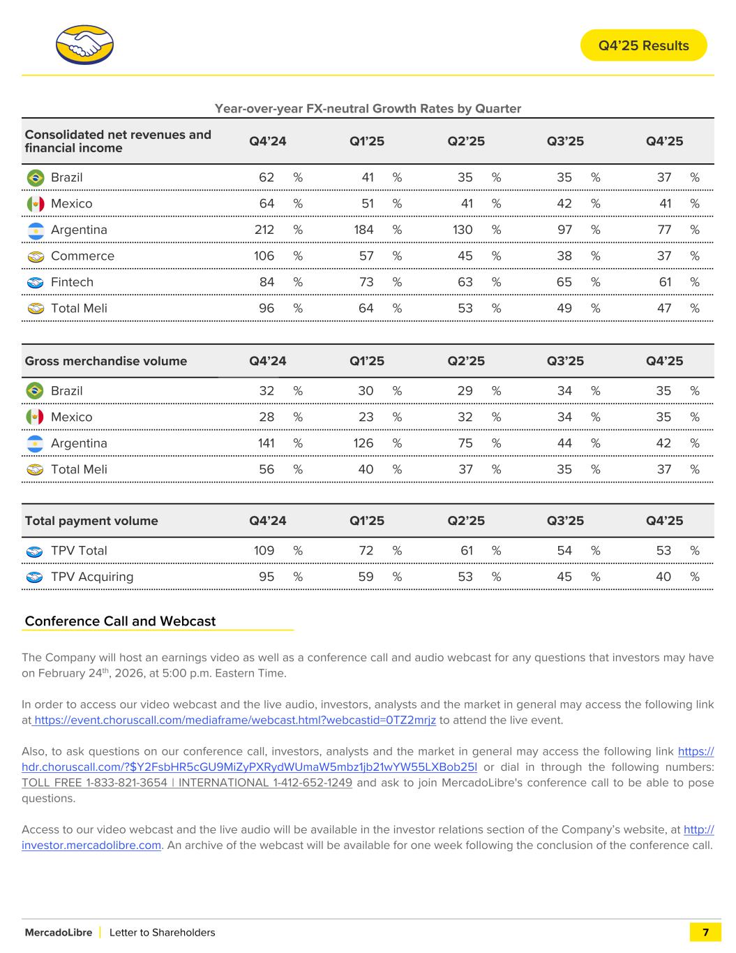 Year-over-year FX-neutral Growth Rates by Quarter Consolidated net revenues and financial income Q4’24 Q1’25 Q2’25 Q3’25 Q4’25 Brazil 62 % 41 % 35 % 35 % 37 % Mexico 64 % 51 % 41 % 42 % 41 % Argentina 212 % 184 % 130 % 97 % 77 % Commerce 106 % 57 % 45 % 38 % 37 % Fintech 84 % 73 % 63 % 65 % 61 % Total Meli 96 % 64 % 53 % 49 % 47 % Gross merchandise volume Q4’24 Q1’25 Q2’25 Q3’25 Q4’25 Brazil 32 % 30 % 29 % 34 % 35 % Mexico 28 % 23 % 32 % 34 % 35 % Argentina 141 % 126 % 75 % 44 % 42 % Total Meli 56 % 40 % 37 % 35 % 37 % Total payment volume Q4’24 Q1’25 Q2’25 Q3’25 Q4’25 TPV Total 109 % 72 % 61 % 54 % 53 % TPV Acquiring 95 % 59 % 53 % 45 % 40 % Conference Call and Webcast The Company will host an earnings video as well as a conference call and audio webcast for any questions that investors may have on February 24th, 2026, at 5:00 p.m. Eastern Time. In order to access our video webcast and the live audio, investors, analysts and the market in general may access the following link at https://event.choruscall.com/mediaframe/webcast.html?webcastid=0TZ2mrjz to attend the live event. Also, to ask questions on our conference call, investors, analysts and the market in general may access the following link https:// hdr.choruscall.com/?$Y2FsbHR5cGU9MiZyPXRydWUmaW5mbz1jb21wYW55LXBob25l or dial in through the following numbers: TOLL FREE 1-833-821-3654 | INTERNATIONAL 1-412-652-1249 and ask to join MercadoLibre's conference call to be able to pose questions. Access to our video webcast and the live audio will be available in the investor relations section of the Company’s website, at http:// investor.mercadolibre.com. An archive of the webcast will be available for one week following the conclusion of the conference call. MercadoLibre Letter to Shareholders 7 Q4’25 Results