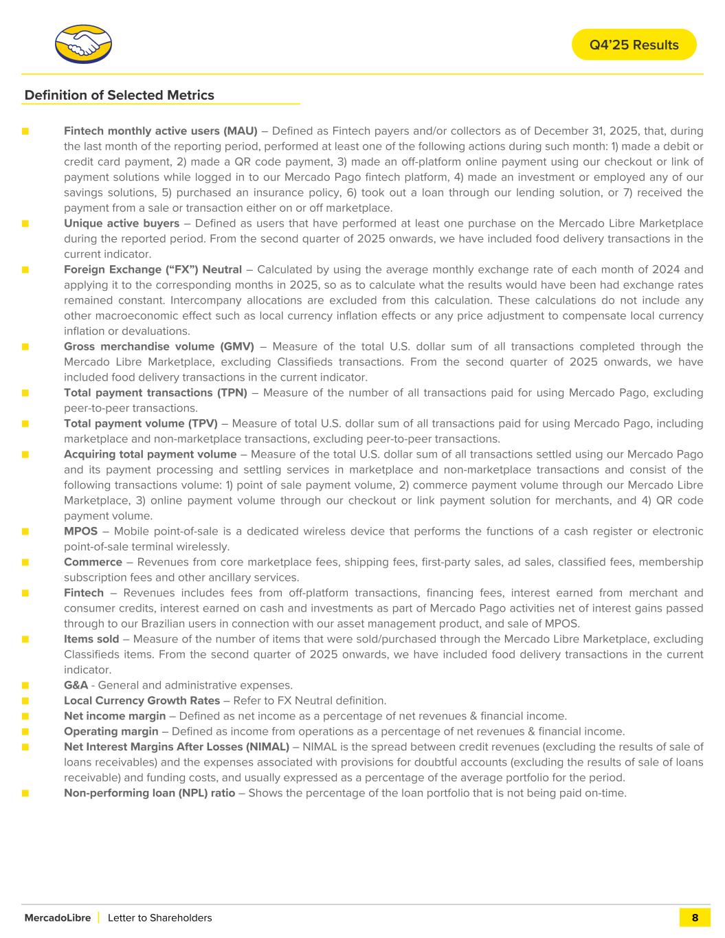 Definition of Selected Metrics ■ Fintech monthly active users (MAU) – Defined as Fintech payers and/or collectors as of December 31, 2025, that, during the last month of the reporting period, performed at least one of the following actions during such month: 1) made a debit or credit card payment, 2) made a QR code payment, 3) made an off-platform online payment using our checkout or link of payment solutions while logged in to our Mercado Pago fintech platform, 4) made an investment or employed any of our savings solutions, 5) purchased an insurance policy, 6) took out a loan through our lending solution, or 7) received the payment from a sale or transaction either on or off marketplace. ■ Unique active buyers – Defined as users that have performed at least one purchase on the Mercado Libre Marketplace during the reported period. From the second quarter of 2025 onwards, we have included food delivery transactions in the current indicator. ■ Foreign Exchange (“FX”) Neutral – Calculated by using the average monthly exchange rate of each month of 2024 and applying it to the corresponding months in 2025, so as to calculate what the results would have been had exchange rates remained constant. Intercompany allocations are excluded from this calculation. These calculations do not include any other macroeconomic effect such as local currency inflation effects or any price adjustment to compensate local currency inflation or devaluations. ■ Gross merchandise volume (GMV) – Measure of the total U.S. dollar sum of all transactions completed through the Mercado Libre Marketplace, excluding Classifieds transactions. From the second quarter of 2025 onwards, we have included food delivery transactions in the current indicator. ■ Total payment transactions (TPN) – Measure of the number of all transactions paid for using Mercado Pago, excluding peer-to-peer transactions. ■ Total payment volume (TPV) – Measure of total U.S. dollar sum of all transactions paid for using Mercado Pago, including marketplace and non-marketplace transactions, excluding peer-to-peer transactions. ■ Acquiring total payment volume – Measure of the total U.S. dollar sum of all transactions settled using our Mercado Pago and its payment processing and settling services in marketplace and non-marketplace transactions and consist of the following transactions volume: 1) point of sale payment volume, 2) commerce payment volume through our Mercado Libre Marketplace, 3) online payment volume through our checkout or link payment solution for merchants, and 4) QR code payment volume. ■ MPOS – Mobile point-of-sale is a dedicated wireless device that performs the functions of a cash register or electronic point-of-sale terminal wirelessly. ■ Commerce – Revenues from core marketplace fees, shipping fees, first-party sales, ad sales, classified fees, membership subscription fees and other ancillary services. ■ Fintech – Revenues includes fees from off-platform transactions, financing fees, interest earned from merchant and consumer credits, interest earned on cash and investments as part of Mercado Pago activities net of interest gains passed through to our Brazilian users in connection with our asset management product, and sale of MPOS. ■ Items sold – Measure of the number of items that were sold/purchased through the Mercado Libre Marketplace, excluding Classifieds items. From the second quarter of 2025 onwards, we have included food delivery transactions in the current indicator. ■ G&A - General and administrative expenses. ■ Local Currency Growth Rates – Refer to FX Neutral definition. ■ Net income margin – Defined as net income as a percentage of net revenues & financial income. ■ Operating margin – Defined as income from operations as a percentage of net revenues & financial income. ■ Net Interest Margins After Losses (NIMAL) – NIMAL is the spread between credit revenues (excluding the results of sale of loans receivables) and the expenses associated with provisions for doubtful accounts (excluding the results of sale of loans receivable) and funding costs, and usually expressed as a percentage of the average portfolio for the period. ■ Non-performing loan (NPL) ratio – Shows the percentage of the loan portfolio that is not being paid on-time. MercadoLibre Letter to Shareholders 8 Q4’25 Results