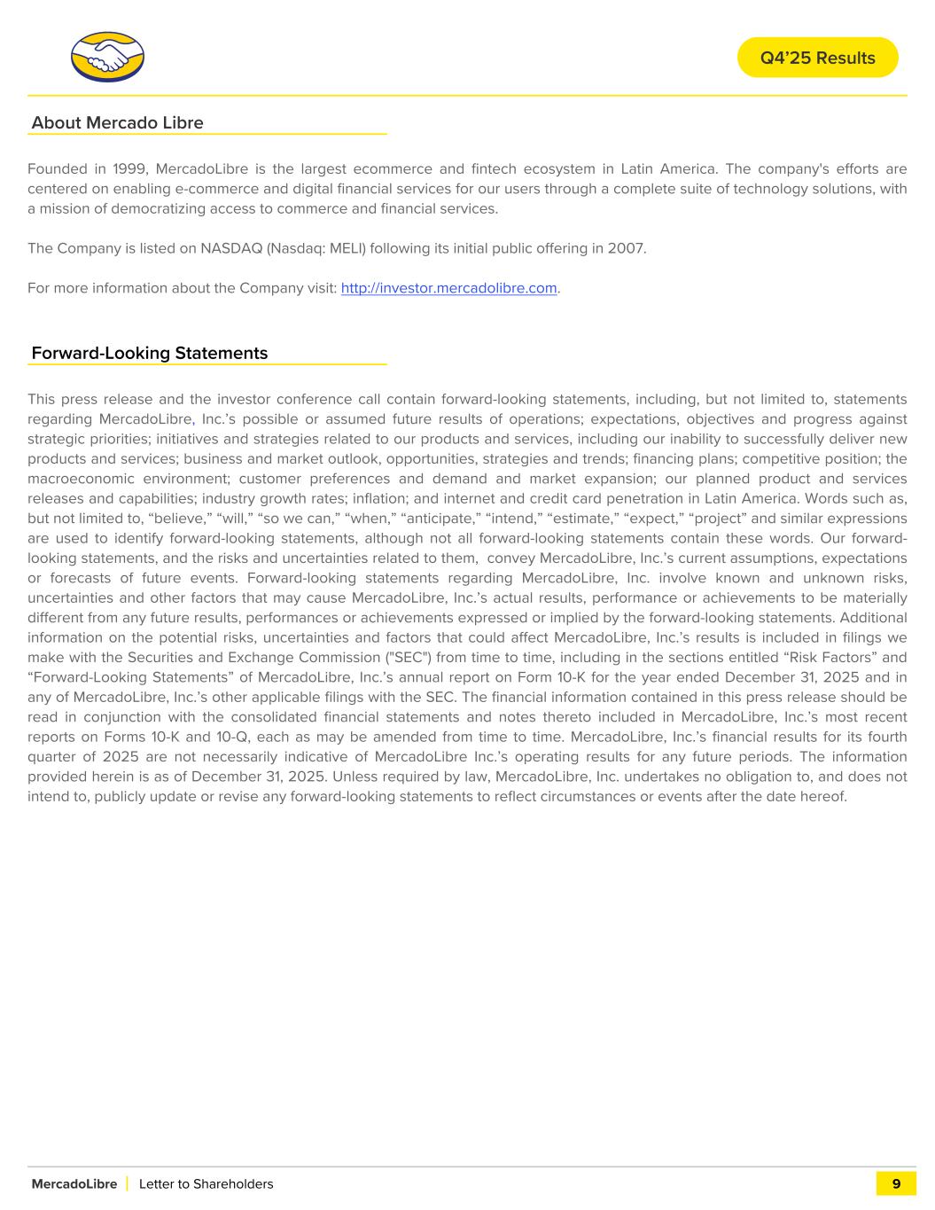 About Mercado Libre Founded in 1999, MercadoLibre is the largest ecommerce and fintech ecosystem in Latin America. The company's efforts are centered on enabling e-commerce and digital financial services for our users through a complete suite of technology solutions, with a mission of democratizing access to commerce and financial services. The Company is listed on NASDAQ (Nasdaq: MELI) following its initial public offering in 2007. For more information about the Company visit: http://investor.mercadolibre.com. Forward-Looking Statements This press release and the investor conference call contain forward-looking statements, including, but not limited to, statements regarding MercadoLibre, Inc.’s possible or assumed future results of operations; expectations, objectives and progress against strategic priorities; initiatives and strategies related to our products and services, including our inability to successfully deliver new products and services; business and market outlook, opportunities, strategies and trends; financing plans; competitive position; the macroeconomic environment; customer preferences and demand and market expansion; our planned product and services releases and capabilities; industry growth rates; inflation; and internet and credit card penetration in Latin America. Words such as, but not limited to, “believe,” “will,” “so we can,” “when,” “anticipate,” “intend,” “estimate,” “expect,” “project” and similar expressions are used to identify forward-looking statements, although not all forward-looking statements contain these words. Our forward- looking statements, and the risks and uncertainties related to them, convey MercadoLibre, Inc.’s current assumptions, expectations or forecasts of future events. Forward-looking statements regarding MercadoLibre, Inc. involve known and unknown risks, uncertainties and other factors that may cause MercadoLibre, Inc.’s actual results, performance or achievements to be materially different from any future results, performances or achievements expressed or implied by the forward-looking statements. Additional information on the potential risks, uncertainties and factors that could affect MercadoLibre, Inc.’s results is included in filings we make with the Securities and Exchange Commission ("SEC") from time to time, including in the sections entitled “Risk Factors” and “Forward-Looking Statements” of MercadoLibre, Inc.’s annual report on Form 10-K for the year ended December 31, 2025 and in any of MercadoLibre, Inc.’s other applicable filings with the SEC. The financial information contained in this press release should be read in conjunction with the consolidated financial statements and notes thereto included in MercadoLibre, Inc.’s most recent reports on Forms 10-K and 10-Q, each as may be amended from time to time. MercadoLibre, Inc.’s financial results for its fourth quarter of 2025 are not necessarily indicative of MercadoLibre Inc.’s operating results for any future periods. The information provided herein is as of December 31, 2025. Unless required by law, MercadoLibre, Inc. undertakes no obligation to, and does not intend to, publicly update or revise any forward-looking statements to reflect circumstances or events after the date hereof. MercadoLibre Letter to Shareholders 9 Q4’25 Results