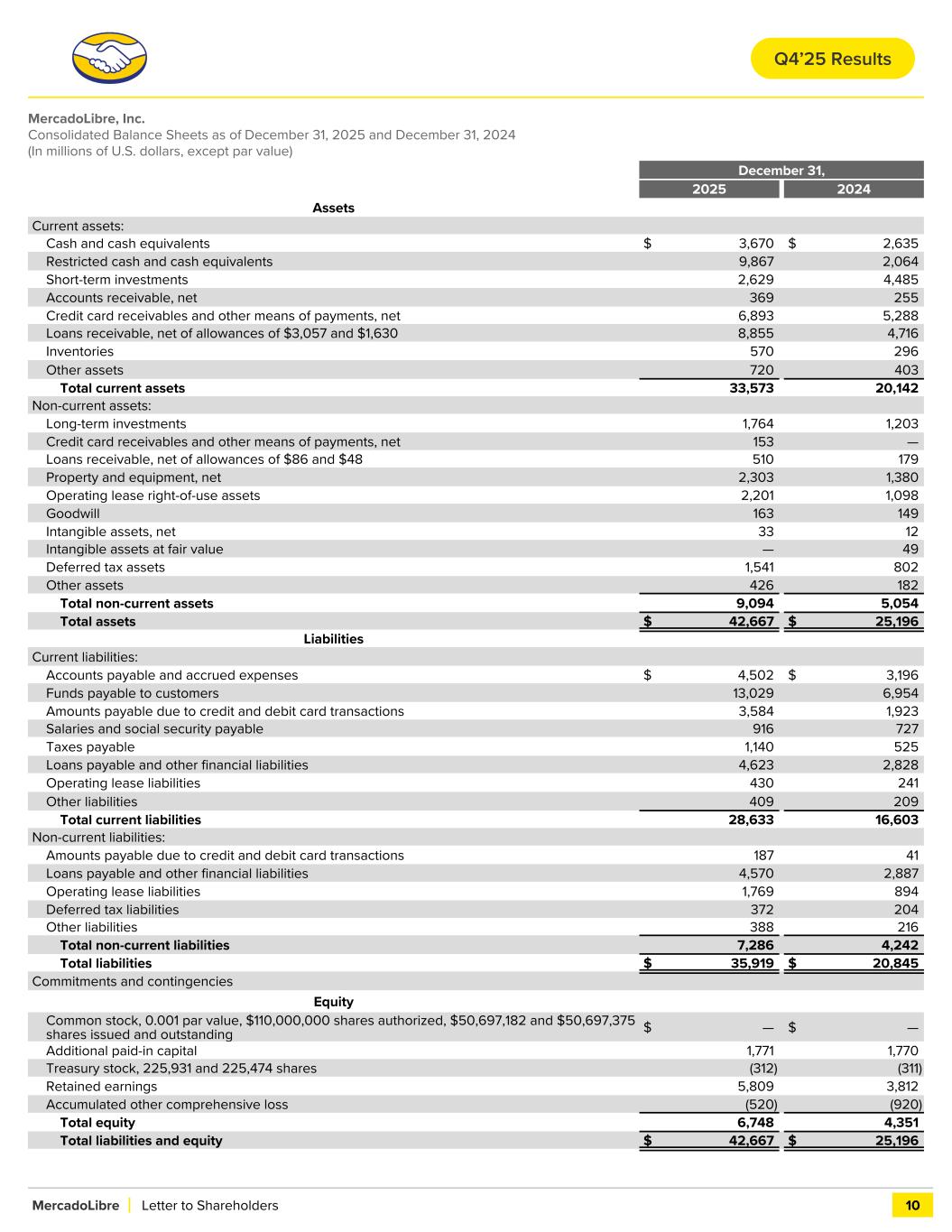 MercadoLibre, Inc. Consolidated Balance Sheets as of December 31, 2025 and December 31, 2024 (In millions of U.S. dollars, except par value) December 31, 2025 2024 Assets Current assets: Cash and cash equivalents $ 3,670 $ 2,635 Restricted cash and cash equivalents 9,867 2,064 Short-term investments 2,629 4,485 Accounts receivable, net 369 255 Credit card receivables and other means of payments, net 6,893 5,288 Loans receivable, net of allowances of $3,057 and $1,630 8,855 4,716 Inventories 570 296 Other assets 720 403 Total current assets 33,573 20,142 Non-current assets: Long-term investments 1,764 1,203 Credit card receivables and other means of payments, net 153 — Loans receivable, net of allowances of $86 and $48 510 179 Property and equipment, net 2,303 1,380 Operating lease right-of-use assets 2,201 1,098 Goodwill 163 149 Intangible assets, net 33 12 Intangible assets at fair value — 49 Deferred tax assets 1,541 802 Other assets 426 182 Total non-current assets 9,094 5,054 Total assets $ 42,667 $ 25,196 Liabilities Current liabilities: Accounts payable and accrued expenses $ 4,502 $ 3,196 Funds payable to customers 13,029 6,954 Amounts payable due to credit and debit card transactions 3,584 1,923 Salaries and social security payable 916 727 Taxes payable 1,140 525 Loans payable and other financial liabilities 4,623 2,828 Operating lease liabilities 430 241 Other liabilities 409 209 Total current liabilities 28,633 16,603 Non-current liabilities: Amounts payable due to credit and debit card transactions 187 41 Loans payable and other financial liabilities 4,570 2,887 Operating lease liabilities 1,769 894 Deferred tax liabilities 372 204 Other liabilities 388 216 Total non-current liabilities 7,286 4,242 Total liabilities $ 35,919 $ 20,845 Commitments and contingencies Equity Common stock, 0.001 par value, $110,000,000 shares authorized, $50,697,182 and $50,697,375 shares issued and outstanding $ — $ — Additional paid-in capital 1,771 1,770 Treasury stock, 225,931 and 225,474 shares (312) (311) Retained earnings 5,809 3,812 Accumulated other comprehensive loss (520) (920) Total equity 6,748 4,351 Total liabilities and equity $ 42,667 $ 25,196 MercadoLibre Letter to Shareholders 10 Q4’25 Results