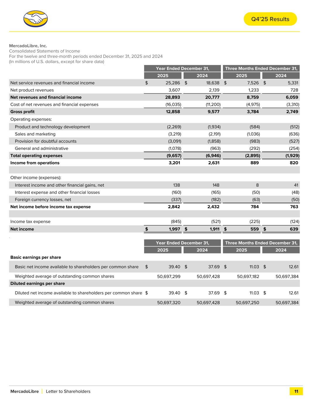 MercadoLibre, Inc. Consolidated Statements of Income For the twelve and three-month periods ended December 31, 2025 and 2024 (In millions of U.S. dollars, except for share data) Year Ended December 31, Three Months Ended December 31, 2025 2024 2025 2024 Net service revenues and financial income $ 25,286 $ 18,638 $ 7,526 $ 5,331 Net product revenues 3,607 2,139 1,233 728 Net revenues and financial income 28,893 20,777 8,759 6,059 Cost of net revenues and financial expenses (16,035) (11,200) (4,975) (3,310) Gross profit 12,858 9,577 3,784 2,749 Operating expenses: Product and technology development (2,269) (1,934) (584) (512) Sales and marketing (3,219) (2,191) (1,036) (636) Provision for doubtful accounts (3,091) (1,858) (983) (527) General and administrative (1,078) (963) (292) (254) Total operating expenses (9,657) (6,946) (2,895) (1,929) Income from operations 3,201 2,631 889 820 Other income (expenses): Interest income and other financial gains, net 138 148 8 41 Interest expense and other financial losses (160) (165) (50) (48) Foreign currency losses, net (337) (182) (63) (50) Net income before income tax expense 2,842 2,432 784 763 Income tax expense (845) (521) (225) (124) Net income $ 1,997 $ 1,911 $ 559 $ 639 . Year Ended December 31, Three Months Ended December 31, 2025 2024 2025 2024 Basic earnings per share Basic net income available to shareholders per common share $ 39.40 $ 37.69 $ 11.03 $ 12.61 Weighted average of outstanding common shares 50,697,299 50,697,428 50,697,182 50,697,384 Diluted earnings per share Diluted net income available to shareholders per common share $ 39.40 $ 37.69 $ 11.03 $ 12.61 Weighted average of outstanding common shares 50,697,320 50,697,428 50,697,250 50,697,384 MercadoLibre Letter to Shareholders 11 Q4’25 Results