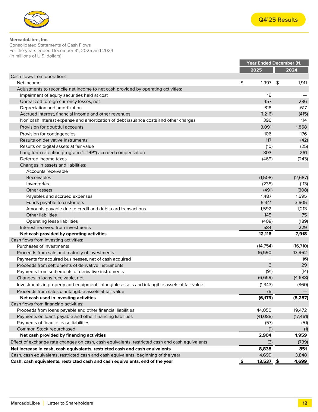 MercadoLibre, Inc. Consolidated Statements of Cash Flows For the years ended December 31, 2025 and 2024 (In millions of U.S. dollars) Year Ended December 31, 2025 2024 Cash flows from operations: Net income $ 1,997 $ 1,911 Adjustments to reconcile net income to net cash provided by operating activities: Impairment of equity securities held at cost 19 — Unrealized foreign currency losses, net 457 286 Depreciation and amortization 818 617 Accrued interest, financial income and other revenues (1,216) (415) Non cash interest expense and amortization of debt issuance costs and other charges 396 114 Provision for doubtful accounts 3,091 1,858 Provision for contingencies 106 176 Results on derivative instruments 117 (42) Results on digital assets at fair value (10) (25) Long term retention program (“LTRP”) accrued compensation 303 261 Deferred income taxes (469) (243) Changes in assets and liabilities: Accounts receivable Receivables (1,508) (2,687) Inventories (235) (113) Other assets (491) (308) Payables and accrued expenses 1,487 1,595 Funds payable to customers 5,341 3,605 Amounts payable due to credit and debit card transactions 1,592 1,213 Other liabilities 145 75 Operating lease liabilities (408) (189) Interest received from investments 584 229 Net cash provided by operating activities 12,116 7,918 Cash flows from investing activities: Purchases of investments (14,754) (16,710) Proceeds from sale and maturity of investments 16,590 13,962 Payments for acquired businesses, net of cash acquired — (6) Proceeds from settlements of derivative instruments 3 29 Payments from settlements of derivative instruments (91) (14) Changes in loans receivable, net (6,659) (4,688) Investments in property and equipment, intangible assets and intangible assets at fair value (1,343) (860) Proceeds from sales of intangible assets at fair value 75 — Net cash used in investing activities (6,179) (8,287) Cash flows from financing activities: Proceeds from loans payable and other financial liabilities 44,050 19,472 Payments on loans payable and other financing liabilities (41,088) (17,461) Payments of finance lease liabilities (57) (51) Common Stock repurchased (1) (1) Net cash provided by financing activities 2,904 1,959 Effect of exchange rate changes on cash, cash equivalents, restricted cash and cash equivalents (3) (739) Net increase in cash, cash equivalents, restricted cash and cash equivalents 8,838 851 Cash, cash equivalents, restricted cash and cash equivalents, beginning of the year 4,699 3,848 Cash, cash equivalents, restricted cash and cash equivalents, end of the year $ 13,537 $ 4,699 MercadoLibre Letter to Shareholders 12 Q4’25 Results