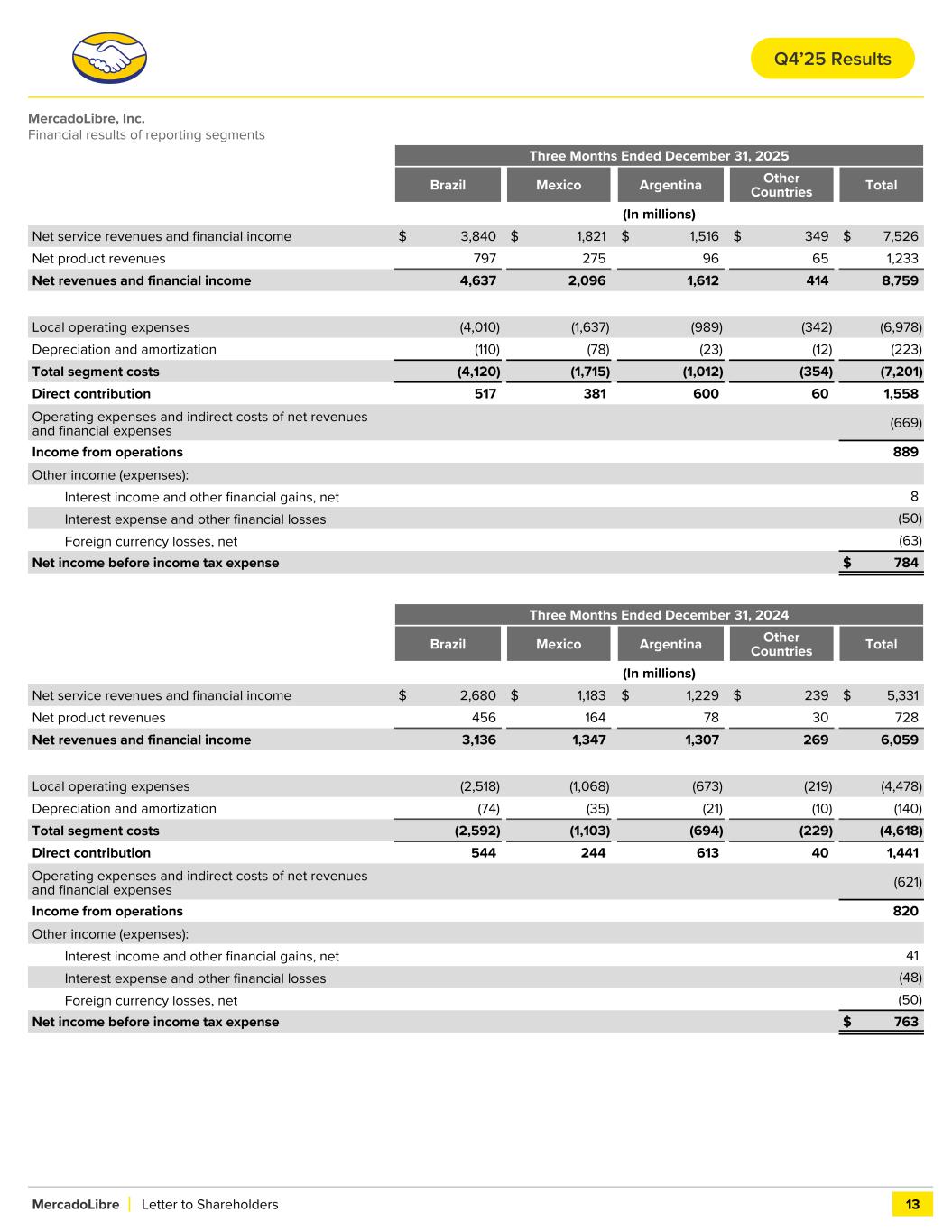 MercadoLibre, Inc. Financial results of reporting segments Three Months Ended December 31, 2025 Brazil Mexico Argentina Other Countries Total (In millions) Net service revenues and financial income $ 3,840 $ 1,821 $ 1,516 $ 349 $ 7,526 Net product revenues 797 275 96 65 1,233 Net revenues and financial income 4,637 2,096 1,612 414 8,759 Local operating expenses (4,010) (1,637) (989) (342) (6,978) Depreciation and amortization (110) (78) (23) (12) (223) Total segment costs (4,120) (1,715) (1,012) (354) (7,201) Direct contribution 517 381 600 60 1,558 Operating expenses and indirect costs of net revenues and financial expenses (669) Income from operations 889 Other income (expenses): Interest income and other financial gains, net 8 Interest expense and other financial losses (50) Foreign currency losses, net (63) Net income before income tax expense $ 784 Three Months Ended December 31, 2024 Brazil Mexico Argentina Other Countries Total (In millions) Net service revenues and financial income $ 2,680 $ 1,183 $ 1,229 $ 239 $ 5,331 Net product revenues 456 164 78 30 728 Net revenues and financial income 3,136 1,347 1,307 269 6,059 Local operating expenses (2,518) (1,068) (673) (219) (4,478) Depreciation and amortization (74) (35) (21) (10) (140) Total segment costs (2,592) (1,103) (694) (229) (4,618) Direct contribution 544 244 613 40 1,441 Operating expenses and indirect costs of net revenues and financial expenses (621) Income from operations 820 Other income (expenses): Interest income and other financial gains, net 41 Interest expense and other financial losses (48) Foreign currency losses, net (50) Net income before income tax expense $ 763 MercadoLibre Letter to Shareholders 13 Q4’25 Results