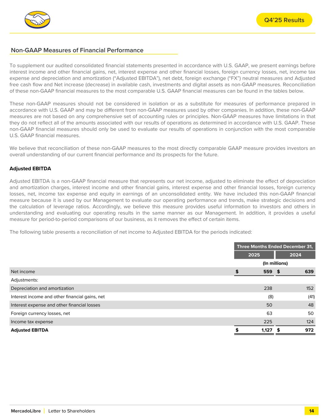 Non-GAAP Measures of Financial Performance To supplement our audited consolidated financial statements presented in accordance with U.S. GAAP, we present earnings before interest income and other financial gains, net, interest expense and other financial losses, foreign currency losses, net, income tax expense and depreciation and amortization (“Adjusted EBITDA”), net debt, foreign exchange (“FX”) neutral measures and Adjusted free cash flow and Net increase (decrease) in available cash, investments and digital assets as non-GAAP measures. Reconciliation of these non-GAAP financial measures to the most comparable U.S. GAAP financial measures can be found in the tables below. These non-GAAP measures should not be considered in isolation or as a substitute for measures of performance prepared in accordance with U.S. GAAP and may be different from non-GAAP measures used by other companies. In addition, these non-GAAP measures are not based on any comprehensive set of accounting rules or principles. Non-GAAP measures have limitations in that they do not reflect all of the amounts associated with our results of operations as determined in accordance with U.S. GAAP. These non-GAAP financial measures should only be used to evaluate our results of operations in conjunction with the most comparable U.S. GAAP financial measures. We believe that reconciliation of these non-GAAP measures to the most directly comparable GAAP measure provides investors an overall understanding of our current financial performance and its prospects for the future. Adjusted EBITDA Adjusted EBITDA is a non-GAAP financial measure that represents our net income, adjusted to eliminate the effect of depreciation and amortization charges, interest income and other financial gains, interest expense and other financial losses, foreign currency losses, net, income tax expense and equity in earnings of an unconsolidated entity. We have included this non-GAAP financial measure because it is used by our Management to evaluate our operating performance and trends, make strategic decisions and the calculation of leverage ratios. Accordingly, we believe this measure provides useful information to investors and others in understanding and evaluating our operating results in the same manner as our Management. In addition, it provides a useful measure for period-to-period comparisons of our business, as it removes the effect of certain items. The following table presents a reconciliation of net income to Adjusted EBITDA for the periods indicated: Three Months Ended December 31, 2025 2024 (In millions) Net income $ 559 $ 639 Adjustments: Depreciation and amortization 238 152 Interest income and other financial gains, net (8) (41) Interest expense and other financial losses 50 48 Foreign currency losses, net 63 50 Income tax expense 225 124 Adjusted EBITDA $ 1,127 $ 972 MercadoLibre Letter to Shareholders 14 Q4’25 Results
