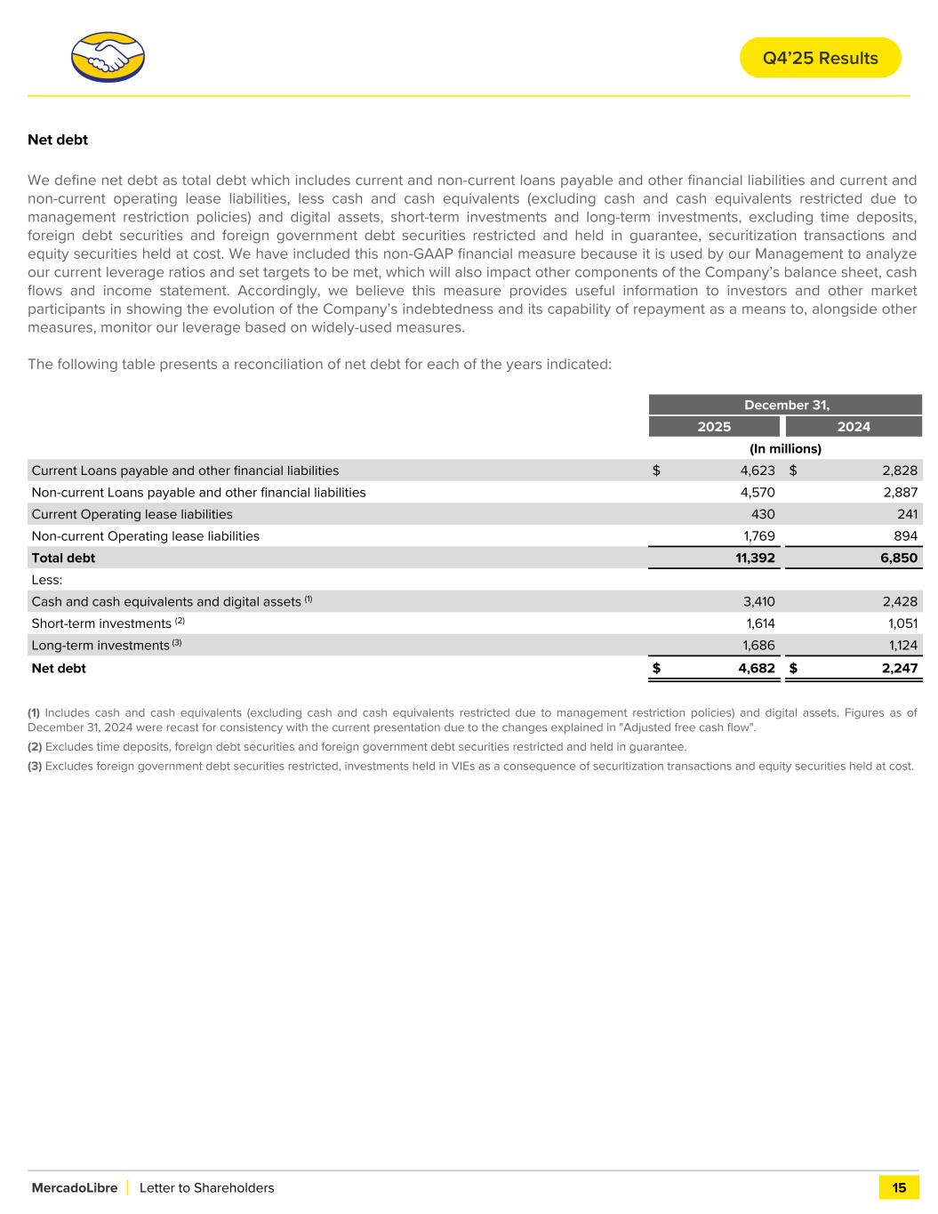 Net debt We define net debt as total debt which includes current and non-current loans payable and other financial liabilities and current and non-current operating lease liabilities, less cash and cash equivalents (excluding cash and cash equivalents restricted due to management restriction policies) and digital assets, short-term investments and long-term investments, excluding time deposits, foreign debt securities and foreign government debt securities restricted and held in guarantee, securitization transactions and equity securities held at cost. We have included this non-GAAP financial measure because it is used by our Management to analyze our current leverage ratios and set targets to be met, which will also impact other components of the Company’s balance sheet, cash flows and income statement. Accordingly, we believe this measure provides useful information to investors and other market participants in showing the evolution of the Company’s indebtedness and its capability of repayment as a means to, alongside other measures, monitor our leverage based on widely-used measures. The following table presents a reconciliation of net debt for each of the years indicated: December 31, 2025 2024 (In millions) Current Loans payable and other financial liabilities $ 4,623 $ 2,828 Non-current Loans payable and other financial liabilities 4,570 2,887 Current Operating lease liabilities 430 241 Non-current Operating lease liabilities 1,769 894 Total debt 11,392 6,850 Less: Cash and cash equivalents and digital assets (1) 3,410 2,428 Short-term investments (2) 1,614 1,051 Long-term investments (3) 1,686 1,124 Net debt $ 4,682 $ 2,247 (1) Includes cash and cash equivalents (excluding cash and cash equivalents restricted due to management restriction policies) and digital assets. Figures as of December 31, 2024 were recast for consistency with the current presentation due to the changes explained in "Adjusted free cash flow". (2) Excludes time deposits, foreign debt securities and foreign government debt securities restricted and held in guarantee. (3) Excludes foreign government debt securities restricted, investments held in VIEs as a consequence of securitization transactions and equity securities held at cost. MercadoLibre Letter to Shareholders 15 Q4’25 Results