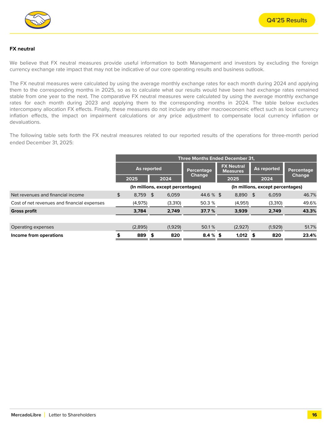 FX neutral We believe that FX neutral measures provide useful information to both Management and investors by excluding the foreign currency exchange rate impact that may not be indicative of our core operating results and business outlook. The FX neutral measures were calculated by using the average monthly exchange rates for each month during 2024 and applying them to the corresponding months in 2025, so as to calculate what our results would have been had exchange rates remained stable from one year to the next. The comparative FX neutral measures were calculated by using the average monthly exchange rates for each month during 2023 and applying them to the corresponding months in 2024. The table below excludes intercompany allocation FX effects. Finally, these measures do not include any other macroeconomic effect such as local currency inflation effects, the impact on impairment calculations or any price adjustment to compensate local currency inflation or devaluations. The following table sets forth the FX neutral measures related to our reported results of the operations for three-month period ended December 31, 2025: Three Months Ended December 31, As reported Percentage Change FX Neutral Measures As reported Percentage Change 2025 2024 2025 2024 (In millions, except percentages) (In millions, except percentages) Net revenues and financial income $ 8,759 $ 6,059 44.6 % $ 8,890 $ 6,059 46.7 % Cost of net revenues and financial expenses (4,975) (3,310) 50.3 % (4,951) (3,310) 49.6 % Gross profit 3,784 2,749 37.7 % 3,939 2,749 43.3 % Operating expenses (2,895) (1,929) 50.1 % (2,927) (1,929) 51.7 % Income from operations $ 889 $ 820 8.4 % $ 1,012 $ 820 23.4 % MercadoLibre Letter to Shareholders 16 Q4’25 Results