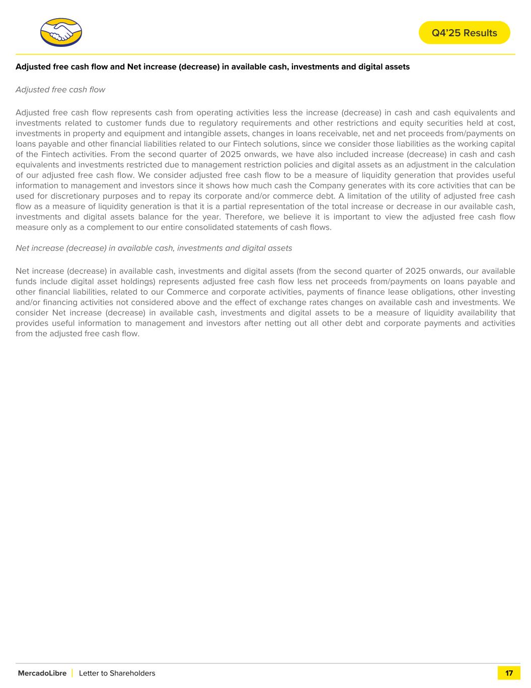 Adjusted free cash flow and Net increase (decrease) in available cash, investments and digital assets Adjusted free cash flow Adjusted free cash flow represents cash from operating activities less the increase (decrease) in cash and cash equivalents and investments related to customer funds due to regulatory requirements and other restrictions and equity securities held at cost, investments in property and equipment and intangible assets, changes in loans receivable, net and net proceeds from/payments on loans payable and other financial liabilities related to our Fintech solutions, since we consider those liabilities as the working capital of the Fintech activities. From the second quarter of 2025 onwards, we have also included increase (decrease) in cash and cash equivalents and investments restricted due to management restriction policies and digital assets as an adjustment in the calculation of our adjusted free cash flow. We consider adjusted free cash flow to be a measure of liquidity generation that provides useful information to management and investors since it shows how much cash the Company generates with its core activities that can be used for discretionary purposes and to repay its corporate and/or commerce debt. A limitation of the utility of adjusted free cash flow as a measure of liquidity generation is that it is a partial representation of the total increase or decrease in our available cash, investments and digital assets balance for the year. Therefore, we believe it is important to view the adjusted free cash flow measure only as a complement to our entire consolidated statements of cash flows. Net increase (decrease) in available cash, investments and digital assets Net increase (decrease) in available cash, investments and digital assets (from the second quarter of 2025 onwards, our available funds include digital asset holdings) represents adjusted free cash flow less net proceeds from/payments on loans payable and other financial liabilities, related to our Commerce and corporate activities, payments of finance lease obligations, other investing and/or financing activities not considered above and the effect of exchange rates changes on available cash and investments. We consider Net increase (decrease) in available cash, investments and digital assets to be a measure of liquidity availability that provides useful information to management and investors after netting out all other debt and corporate payments and activities from the adjusted free cash flow. MercadoLibre Letter to Shareholders 17 Q4’25 Results