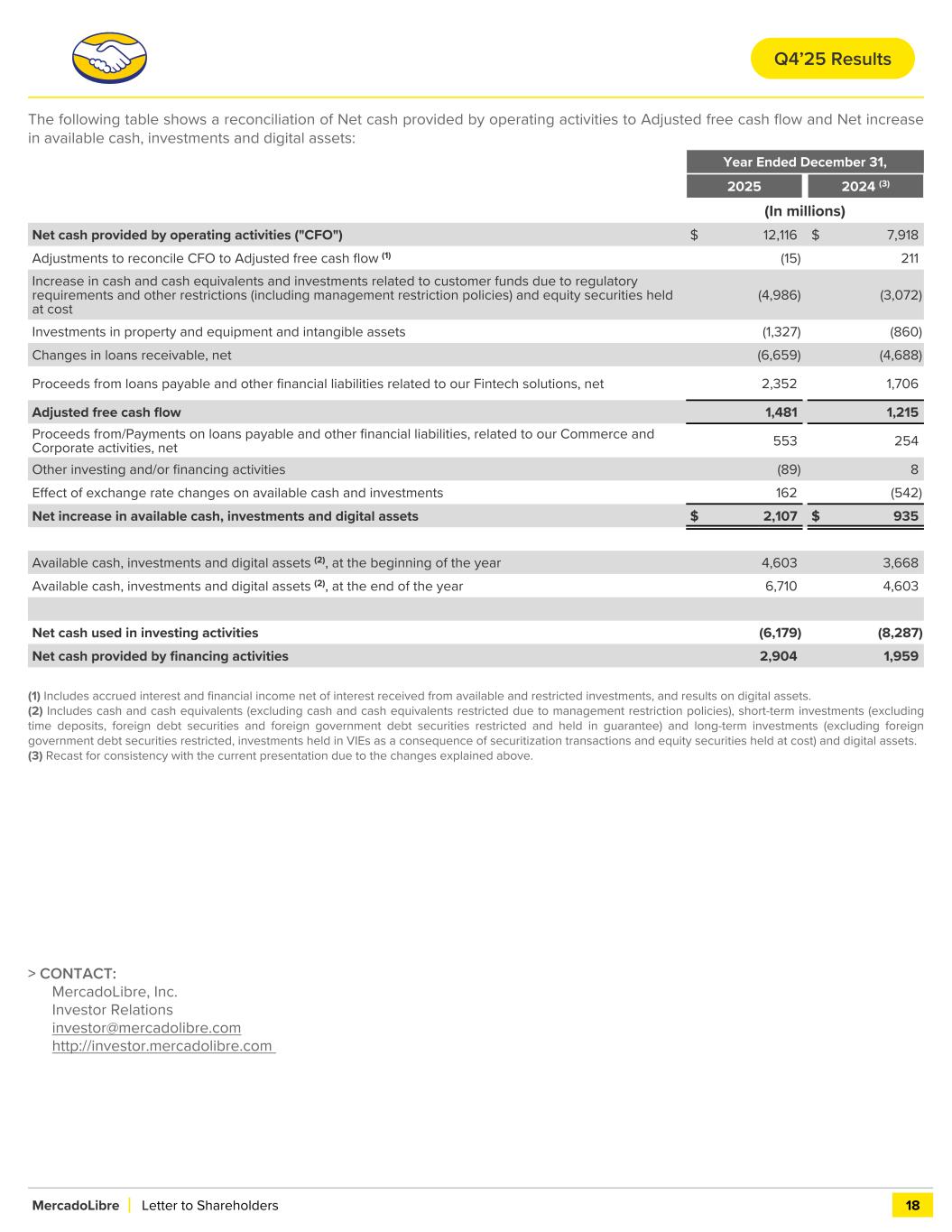 The following table shows a reconciliation of Net cash provided by operating activities to Adjusted free cash flow and Net increase in available cash, investments and digital assets: Year Ended December 31, 2025 2024 (3) (In millions) Net cash provided by operating activities ("CFO") $ 12,116 $ 7,918 Adjustments to reconcile CFO to Adjusted free cash flow (1) (15) 211 Increase in cash and cash equivalents and investments related to customer funds due to regulatory requirements and other restrictions (including management restriction policies) and equity securities held at cost (4,986) (3,072) Investments in property and equipment and intangible assets (1,327) (860) Changes in loans receivable, net (6,659) (4,688) Proceeds from loans payable and other financial liabilities related to our Fintech solutions, net 2,352 1,706 Adjusted free cash flow 1,481 1,215 Proceeds from/Payments on loans payable and other financial liabilities, related to our Commerce and Corporate activities, net 553 254 Other investing and/or financing activities (89) 8 Effect of exchange rate changes on available cash and investments 162 (542) Net increase in available cash, investments and digital assets $ 2,107 $ 935 Available cash, investments and digital assets (2), at the beginning of the year 4,603 3,668 Available cash, investments and digital assets (2), at the end of the year 6,710 4,603 Net cash used in investing activities (6,179) (8,287) Net cash provided by financing activities 2,904 1,959 (1) Includes accrued interest and financial income net of interest received from available and restricted investments, and results on digital assets. (2) Includes cash and cash equivalents (excluding cash and cash equivalents restricted due to management restriction policies), short-term investments (excluding time deposits, foreign debt securities and foreign government debt securities restricted and held in guarantee) and long-term investments (excluding foreign government debt securities restricted, investments held in VIEs as a consequence of securitization transactions and equity securities held at cost) and digital assets. (3) Recast for consistency with the current presentation due to the changes explained above. > CONTACT: MercadoLibre, Inc. Investor Relations investor@mercadolibre.com http://investor.mercadolibre.com MercadoLibre Letter to Shareholders 18 Q4’25 Results