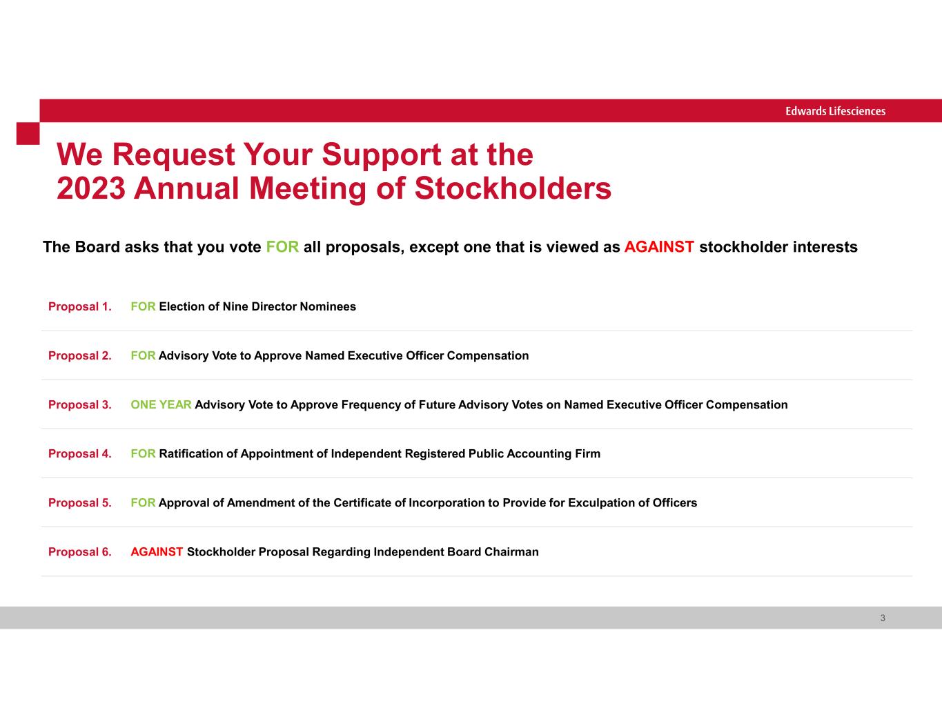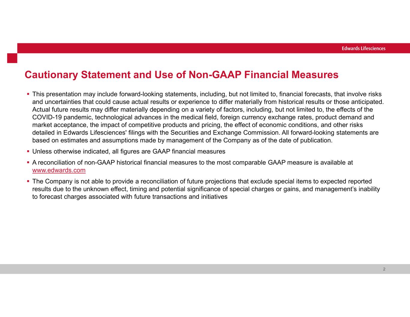Cautionary Statement and Use of Non-GAAP Financial Measures 2 This presentation may include forward-looking statements, including, but not limited to, financial forecasts, that involve risks and uncertainties that could cause actual results or experience to differ materially from historical results or those anticipated. Actual future results may differ materially depending on a variety of factors, including, but not limited to, the effects of the COVID-19 pandemic, technological advances in the medical field, foreign currency exchange rates, product demand and market acceptance, the impact of competitive products and pricing, the effect of economic conditions, and other risks detailed in Edwards Lifesciences' filings with the Securities and Exchange Commission. All forward-looking statements are based on estimates and assumptions made by management of the Company as of the date of publication. Unless otherwise indicated, all figures are GAAP financial measures A reconciliation of non-GAAP historical financial measures to the most comparable GAAP measure is available at www.edwards.com The Company is not able to provide a reconciliation of future projections that exclude special items to expected reported results due to the unknown effect, timing and potential significance of special charges or gains, and management’s inability to forecast charges associated with future transactions and initiatives