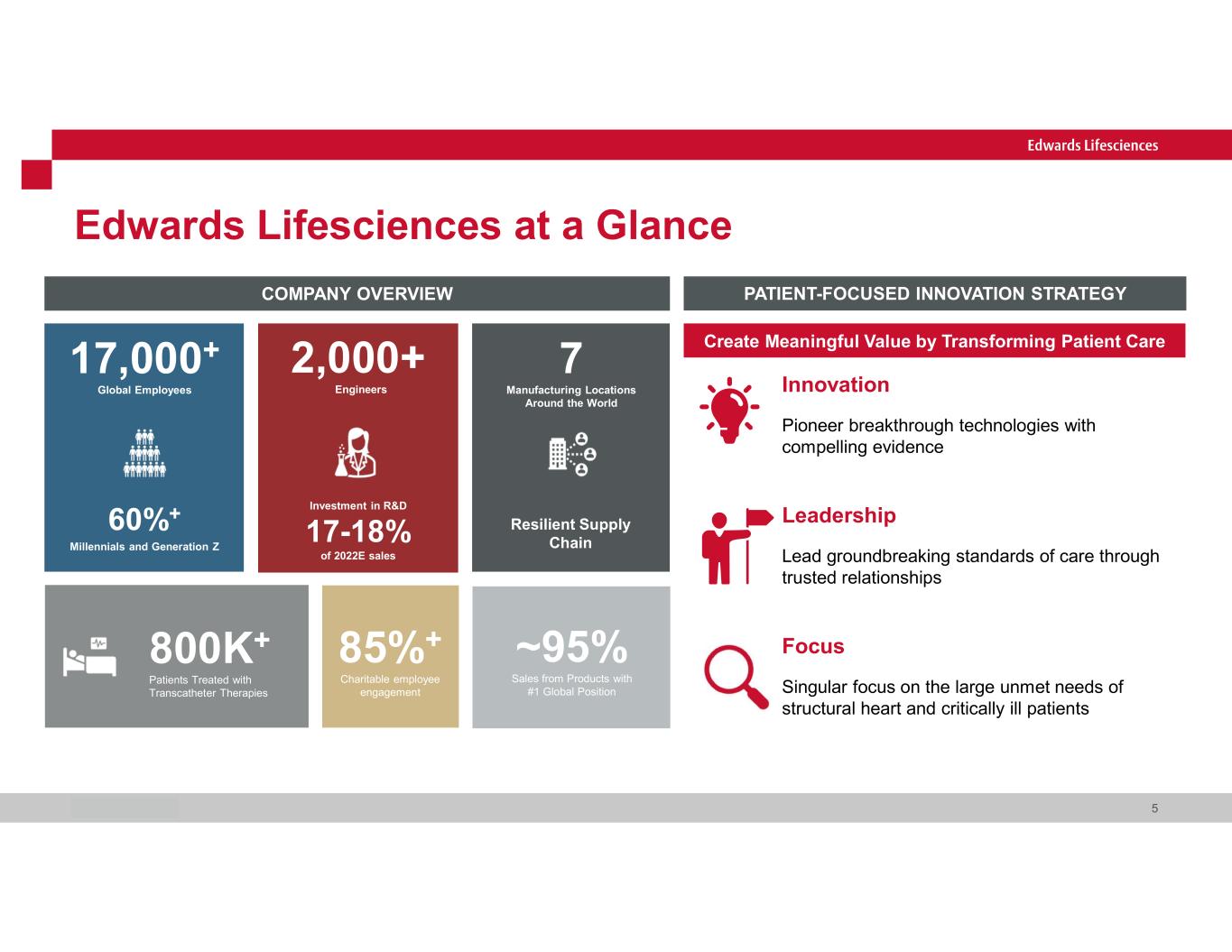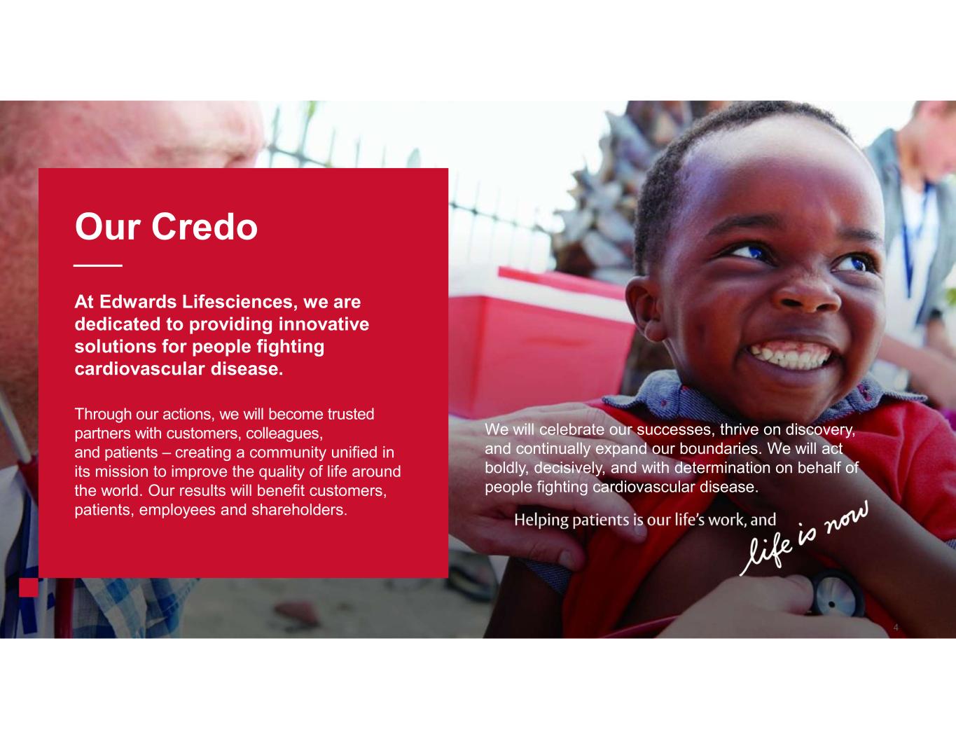 Our Credo We will celebrate our successes, thrive on discovery, and continually expand our boundaries. We will act boldly, decisively, and with determination on behalf of people fighting cardiovascular disease. At Edwards Lifesciences, we are dedicated to providing innovative solutions for people fighting cardiovascular disease. Through our actions, we will become trusted partners with customers, colleagues, and patients – creating a community unified in its mission to improve the quality of life around the world. Our results will benefit customers, patients, employees and shareholders. 4