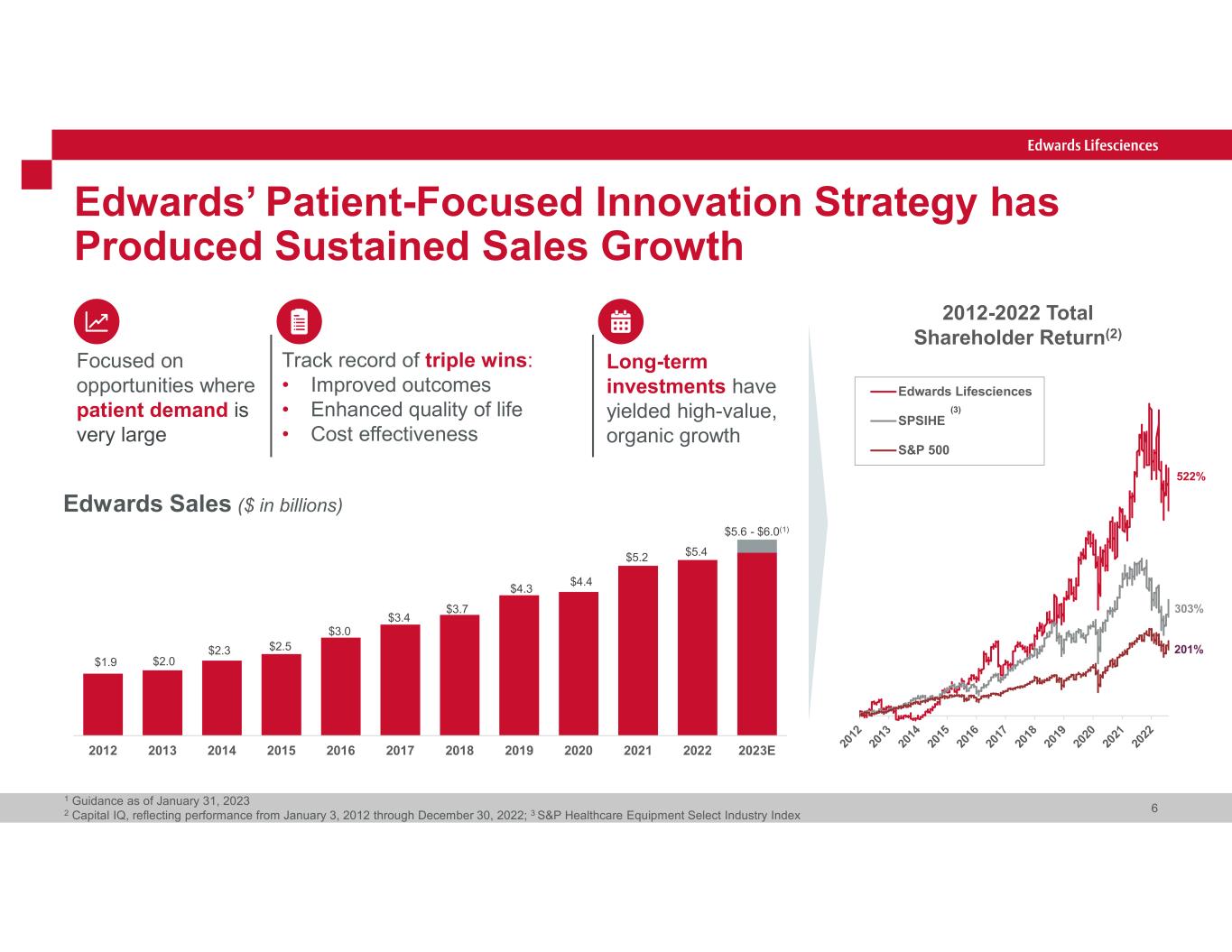 Edwards Lifesciences at a Glance 5 COMPANY OVERVIEW 800K+ Patients Treated with Transcatheter Therapies 85%+ Charitable employee engagement ~95% Sales from Products with #1 Global Position PATIENT-FOCUSED INNOVATION STRATEGY Lead groundbreaking standards of care through trusted relationships Leadership Singular focus on the large unmet needs of structural heart and critically ill patients Focus Pioneer breakthrough technologies with compelling evidence Innovation Create Meaningful Value by Transforming Patient Care 60%+ Millennials and Generation Z 17,000+ Global Employees 2,000+ Engineers Investment in R&D 17-18% of 2022E sales 7 Manufacturing Locations Around the World Resilient Supply Chain