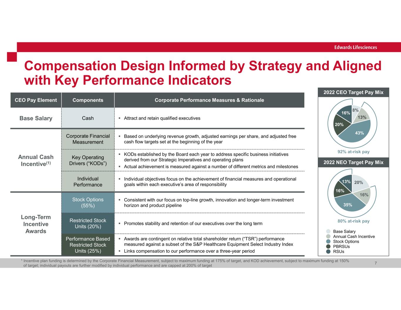 CEO Pay Element Components Corporate Performance Measures & Rationale Base Salary Cash Attract and retain qualified executives Annual Cash Incentive(1) Corporate Financial Measurement Based on underlying revenue growth, adjusted earnings per share, and adjusted free cash flow targets set at the beginning of the year Key Operating Drivers (“KODs”) KODs established by the Board each year to address specific business initiatives derived from our Strategic Imperatives and operating plans Actual achievement is measured against a number of different metrics and milestones Individual Performance Individual objectives focus on the achievement of financial measures and operational goals within each executive’s area of responsibility Long-Term Incentive Awards Stock Options (55%) Consistent with our focus on top-line growth, innovation and longer-term investment horizon and product pipeline Restricted Stock Units (20%) Promotes stability and retention of our executives over the long term Performance Based Restricted Stock Units (25%) Awards are contingent on relative total shareholder return (“TSR”) performance measured against a subset of the S&P Healthcare Equipment Select Industry Index Links compensation to our performance over a three-year period 20% 16% 35% 16% 13% 8% 13% 43% 20% 16% Compensation Design Informed by Strategy and Aligned with Key Performance Indicators 7 1 Incentive plan funding is determined by the Corporate Financial Measurement, subject to maximum funding at 175% of target, and KOD achievement, subject to maximum funding at 150% of target; individual payouts are further modified by individual performance and are capped at 200% of target 2022 CEO Target Pay Mix 92% at-risk pay 80% at-risk pay 2022 NEO Target Pay Mix Base Salary Annual Cash Incentive Stock Options PBRSUs RSUs